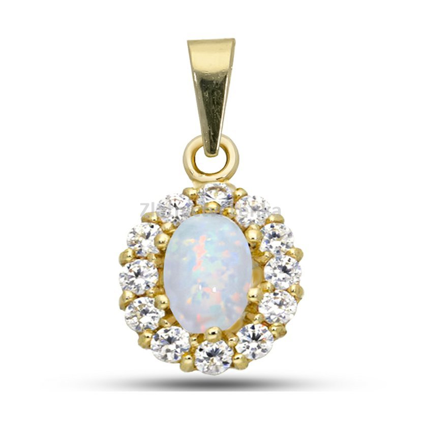 Krásný zlatý přívěsek ve tvaru oválu, který je osázen opálem a zirkony. Nádherně se třpytí ve výstřihu i na halence a jistě potěší každou ženu. Šperk není nutné odkládat na koupání a spaní.