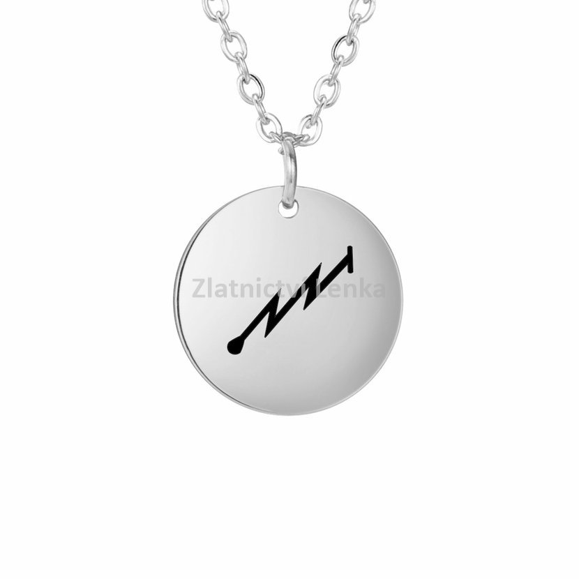 Řetízek s přívěskem z chirurgické oceli, délka řetízku je 45 cm + 5 cm prodlužovací očko, velikost přívěsku je 1,5 × 1,5 cm.