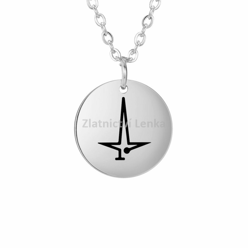 Řetízek s přívěskem z chirurgické oceli, délka řetízku je 45 cm + 5 cm prodlužovací očko, velikost přívěsku je 1,5 × 1,5 cm.