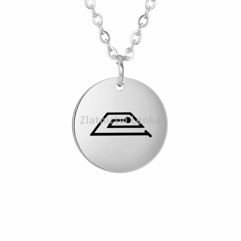 Řetízek s přívěskem z chirurgické oceli, délka řetízku je 45 cm + 5 cm prodlužovací očko, velikost přívěsku je 1,5 × 1,5 cm.