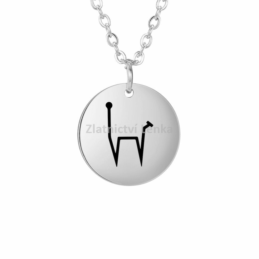 Řetízek s přívěskem z chirurgické oceli, délka řetízku je 45 cm + 5 cm prodlužovací očko, velikost přívěsku je 1,5 × 1,5 cm.