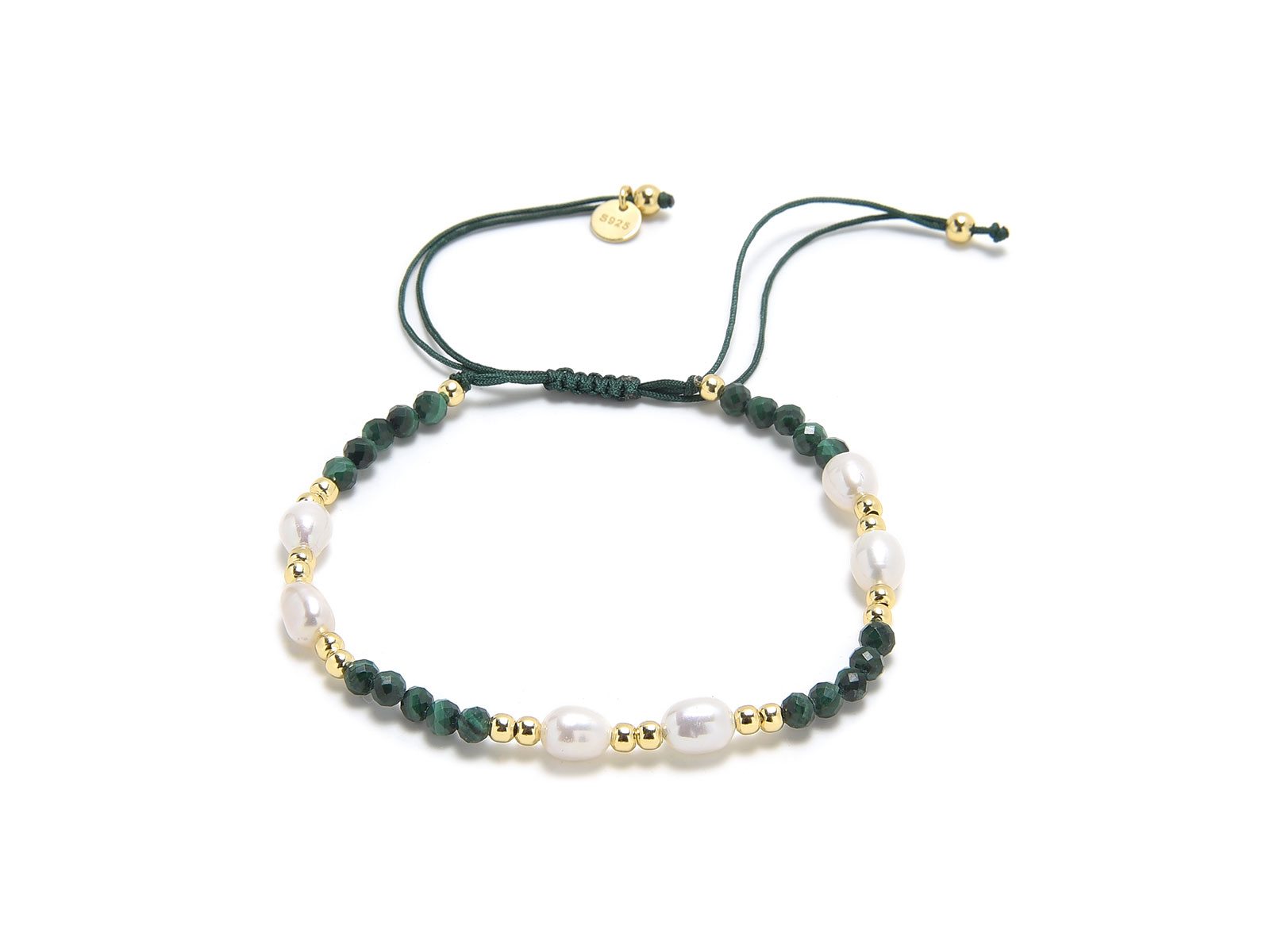🤍 Náramek, který propojuje něhu kultivovaných perel s transformační silou malachitu ve zlatém lesku.