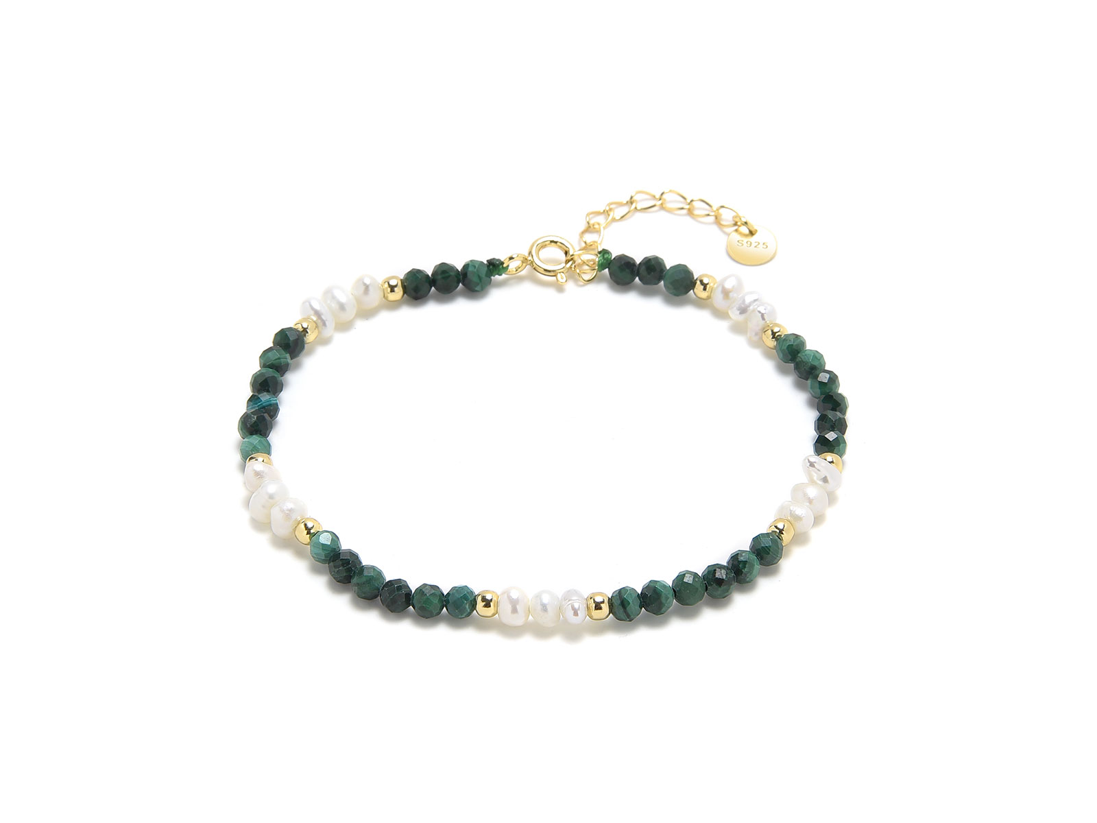 🤍 Náramek, který propojuje něhu kultivovaných perel s transformační silou malachitu ve zlatém lesku.