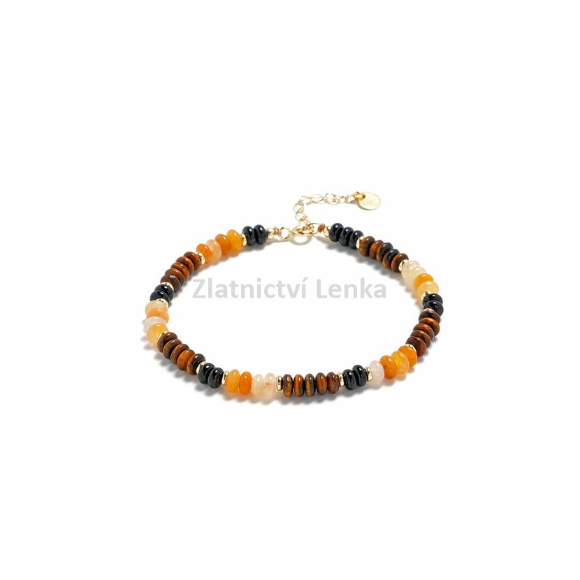 Zářivě zlaté a hnědé tóny symbolizují sílu, odvahu i klid, zatímco zlacené stříbrné komponenty dodávají šperku teplý lesk a elegantní harmonii.