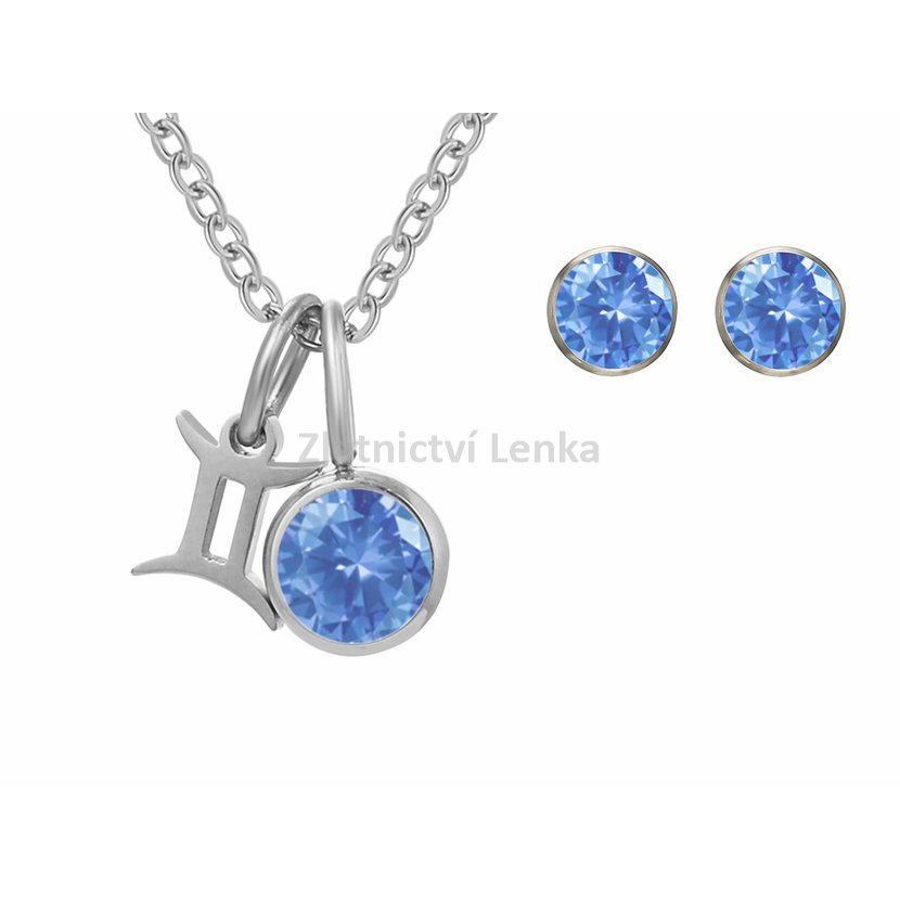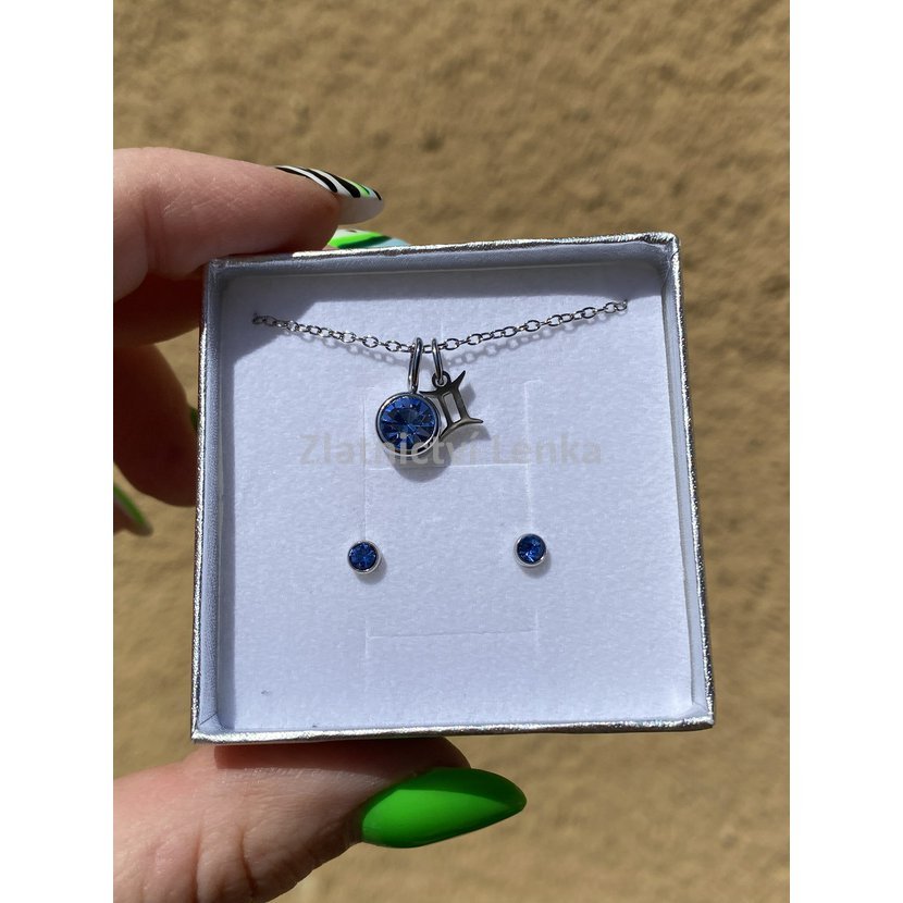Elegantní souprava z chirurgické oceli zahrnuje náhrdelník s přívěskem znamení zvěrokruhu a barevným kamínkem a sladěné pecičkové náušnice. Symbol vašeho znamení i jeho barva v jednom harmonickém celku – jemný, osobní šperk s hvězdným významem.