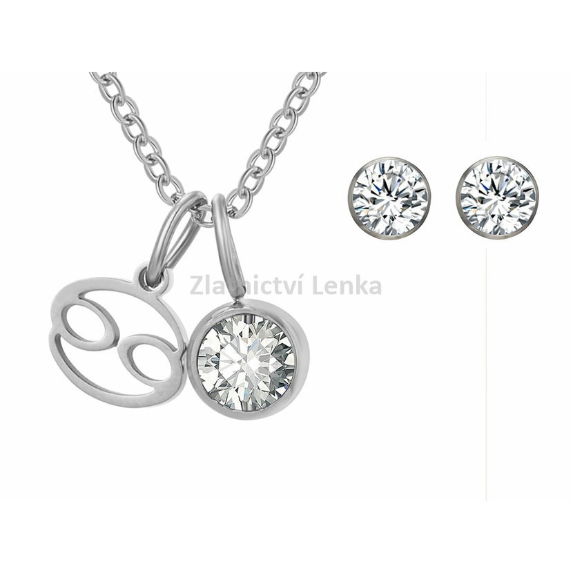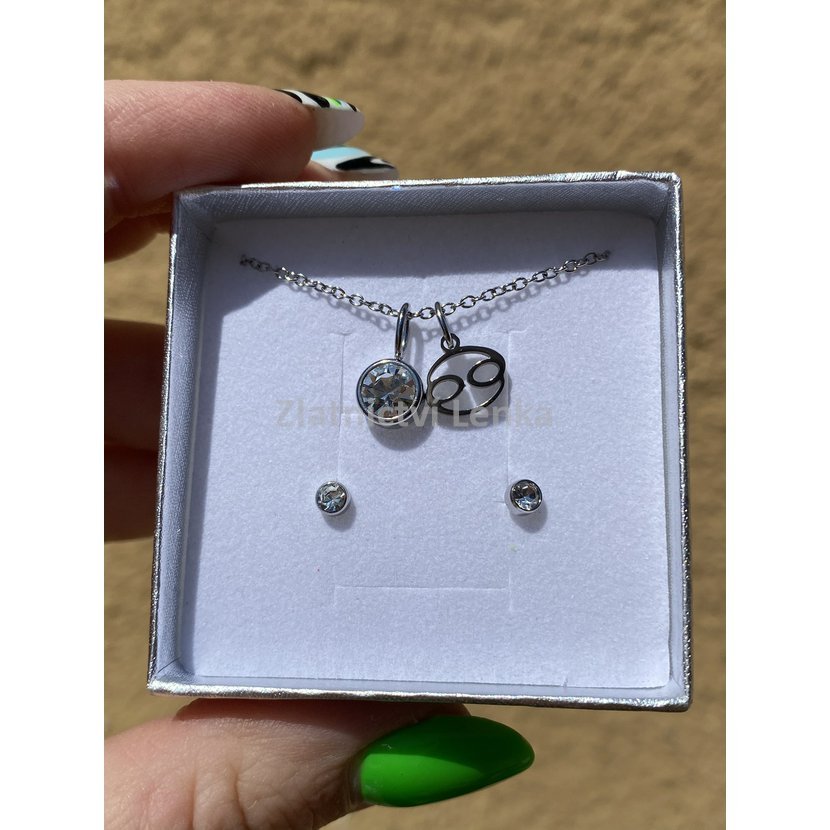 Elegantní souprava z chirurgické oceli zahrnuje náhrdelník s přívěskem znamení zvěrokruhu a barevným kamínkem a sladěné pecičkové náušnice. Symbol vašeho znamení i jeho barva v jednom harmonickém celku – jemný, osobní šperk s hvězdným významem.