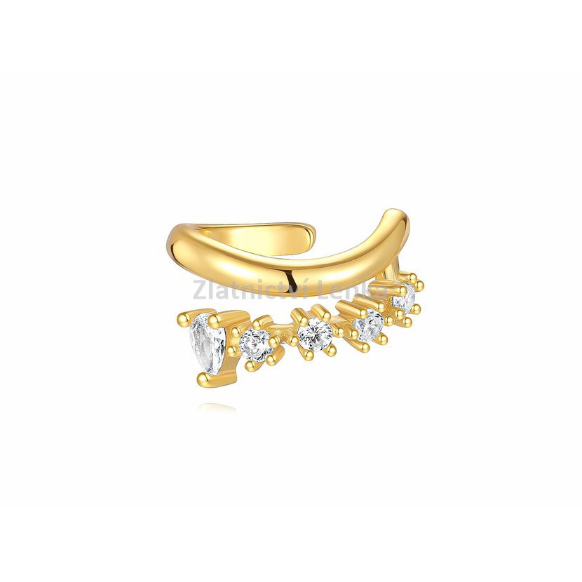 Tento stříbrný ear cuff pozlacený žlutým zlatem zaujme svým jemným, ale výrazným designem. Spodní linie je zdobená řadou třpytivých zirkonů, které postupně vytvářejí krásný světelný efekt. Dominantou je větší kámen na kraji, který dodává šperku luxusní charakter.