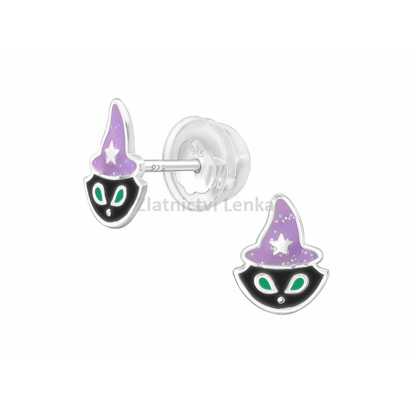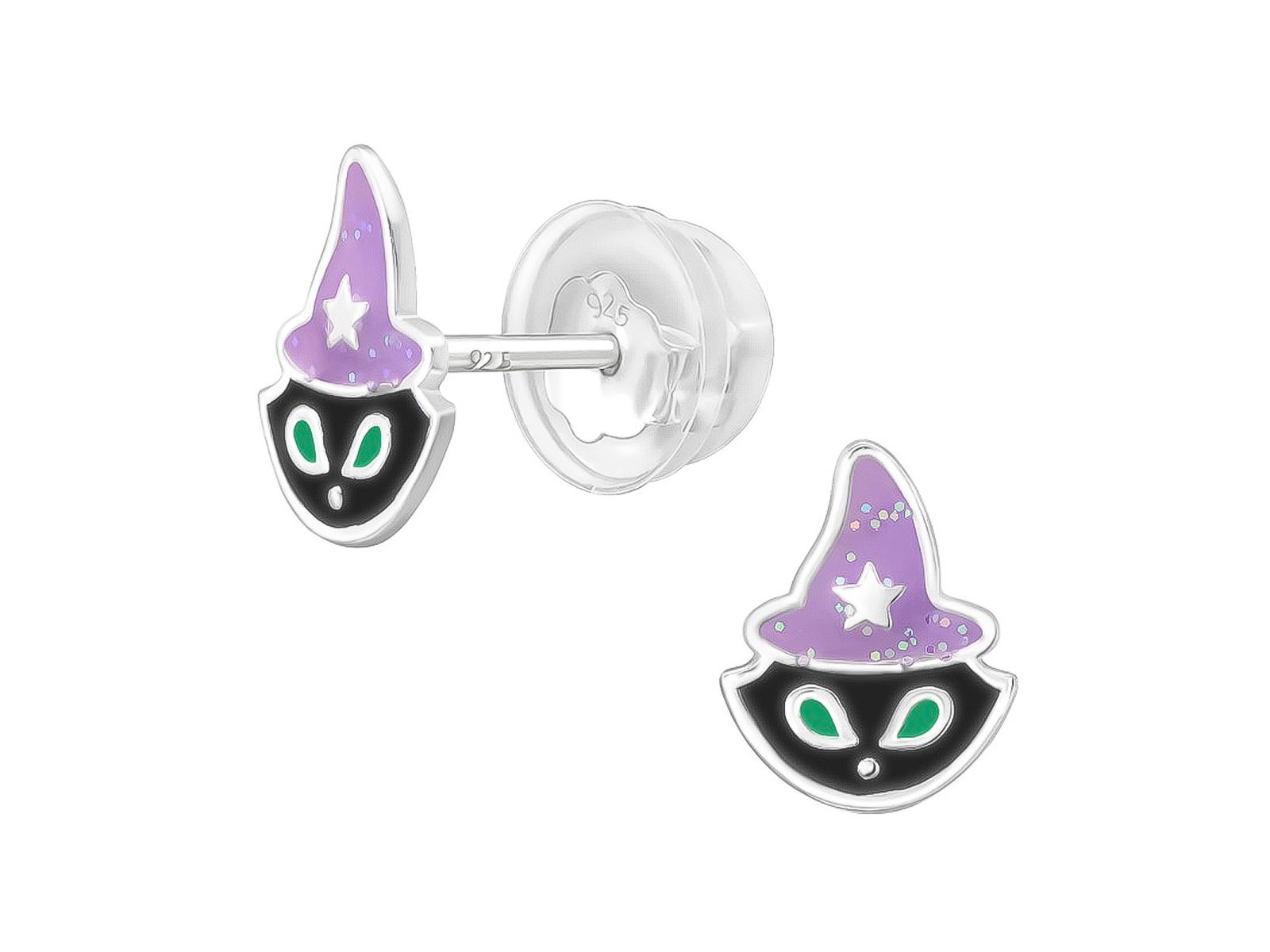 🐱 Zazařte originalitou s těmito stříbrnými náušnicemi ve tvaru kouzelné kočky, které kombinují černý smalt, zelené oči a fialový klobouk se třpytkami – ideální volba pro halloweenský i hravý podzimní styl.