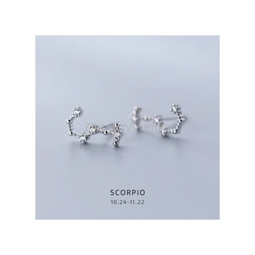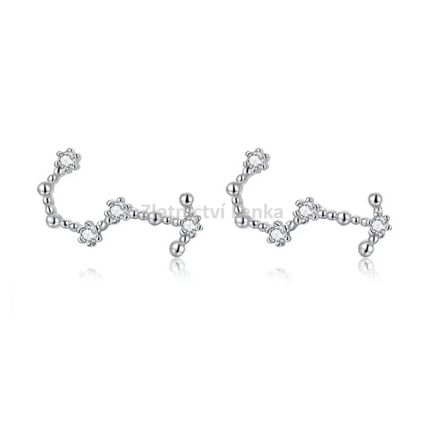 Tyto jemné náušnice ve tvaru souhvězdí Štíra jsou vyrobeny ze sterlingového stříbra 925 a zdobeny třpytivými zirkony, které dodávají šperku jedinečný a nadčasový lesk. Design náušnic připomíná noční oblohu a je inspirován krásou hvězd. Ideální pro milovníky astrologie i ty, kteří hledají subtilní a elegantní doplněk pro každodenní nošení nebo speciální příležitosti. Tyto náušnice podtrhnou vaši individualitu a přinesou kousek hvězdného kouzla do vašeho šatníku.