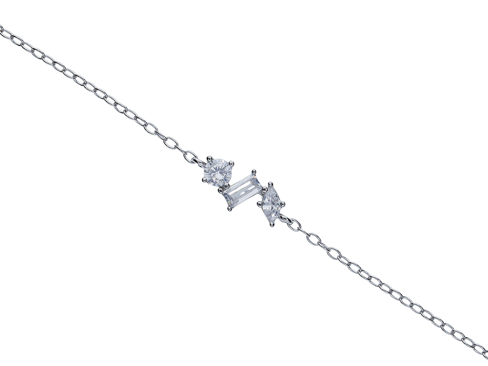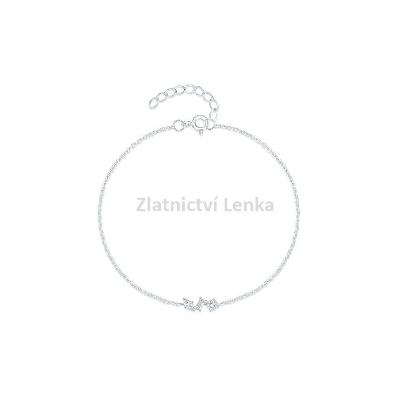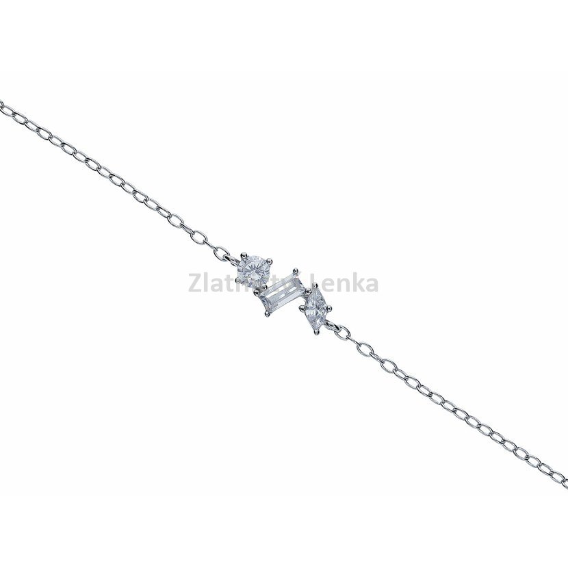 Stříbrný náramek okouzlí precizně zasazenou trojicí čirých zirkonů v kulatém, obdélníkovém a kapkovitém tvaru, které spolu vytvářejí vyvážený a velmi elegantní detail. Každý kámen odráží světlo jiným způsobem, a právě díky této jemné hře tvarů působí šperk sofistikovaně, čistě a nadčasově. Jemný řetízek dodává náramku lehkost a pohodlí, takže se stane krásným doplňkem pro běžné nošení i výjimečné chvíle. Je ideální pro ženy, které milují minimalistické šperky s jemným luxusním akcentem.