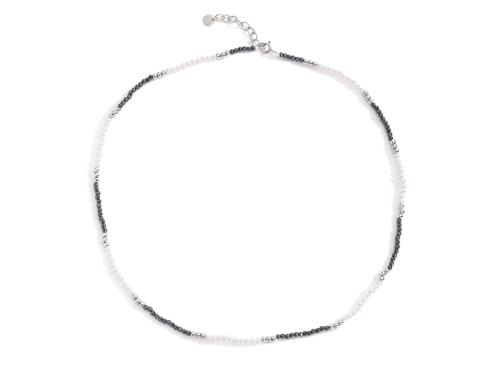 Každý perlový odlesk odhaluje ženskou eleganci, zatímco tmavý lesk hematitu přináší klid a stabilitu duši. Jemné stříbrné komponenty dodávají šperku čistý třpyt a nadčasovou eleganci.