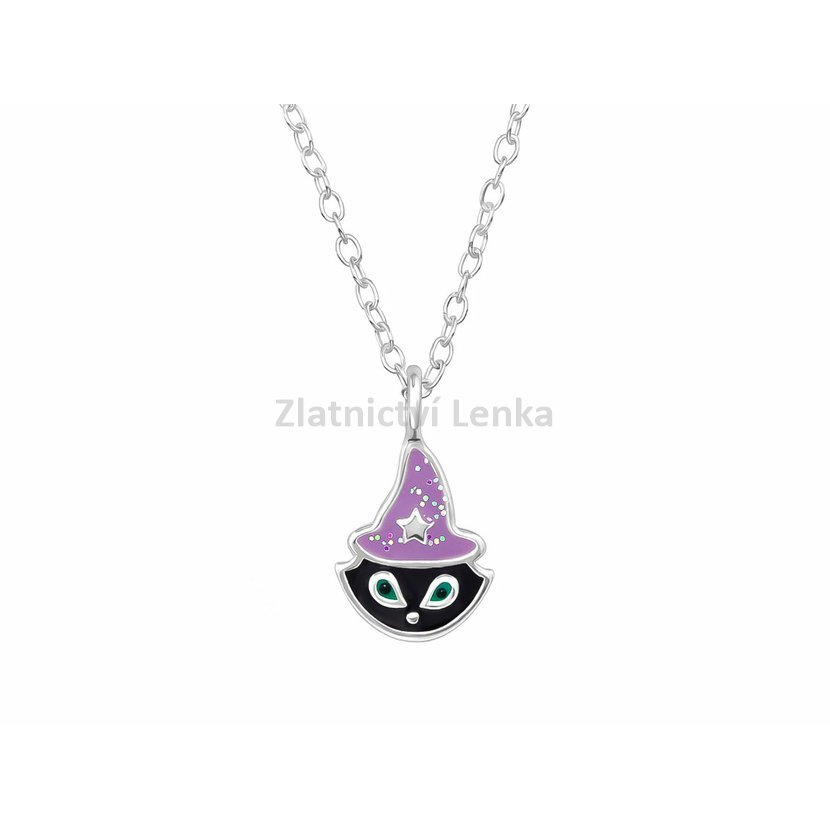 🐱 Ozdobte se kouzlem tajemna s tímto stříbrným řetízkem s přívěskem kouzelné kočky, která září černým smaltem, zelenýma očima a fialovým kloboukem se třpytkami – dokonalý doplněk pro halloweenské i každodenní kouzlení.