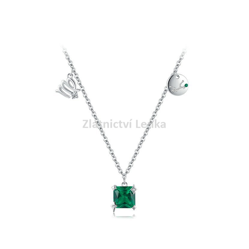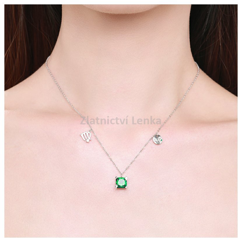 Tento nádherný náhrdelník ze sterlingového stříbra 925 je věnován znamení Panny. Dominantním prvkem šperku je hluboký zelený kámen ve čtvercovém brusu, který symbolizuje stabilitu, praktičnost a odhodlání – typické vlastnosti znamení Panny. Náhrdelník je doplněn přívěskem se symbolem Panny a destičkou s vyobrazením konstelace tohoto znamení. Tento elegantní šperk je ideálním doplňkem pro ty, kteří chtějí nosit svůj astrologický symbol s noblesou a vkusem.