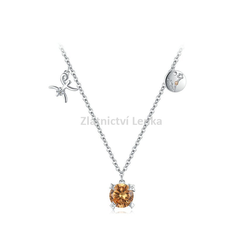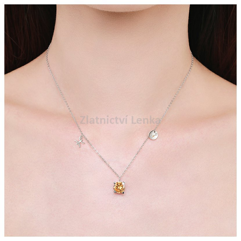 Tento náhrdelník skutečně zobrazuje znamení Ryb. Je vyrobený z kvalitního sterlingového stříbra 925 a zdobený kulatým medově žlutým kamenem, který symbolizuje citlivost a kreativitu spojenou se znamením Ryb. Náhrdelník má přívěsek se symbolem Ryb a destičku s vyobrazením konstelace tohoto znamení. Tento šperk je ideální volbou pro ty, kteří chtějí nosit svůj astrologický symbol s elegancí a vkusem.