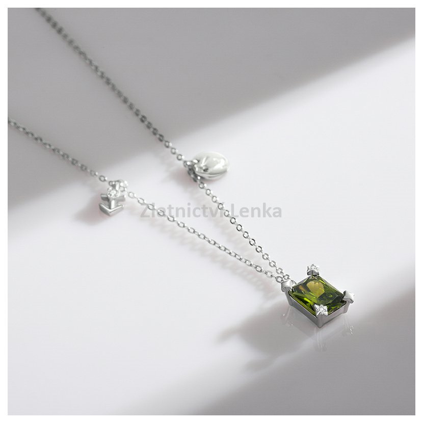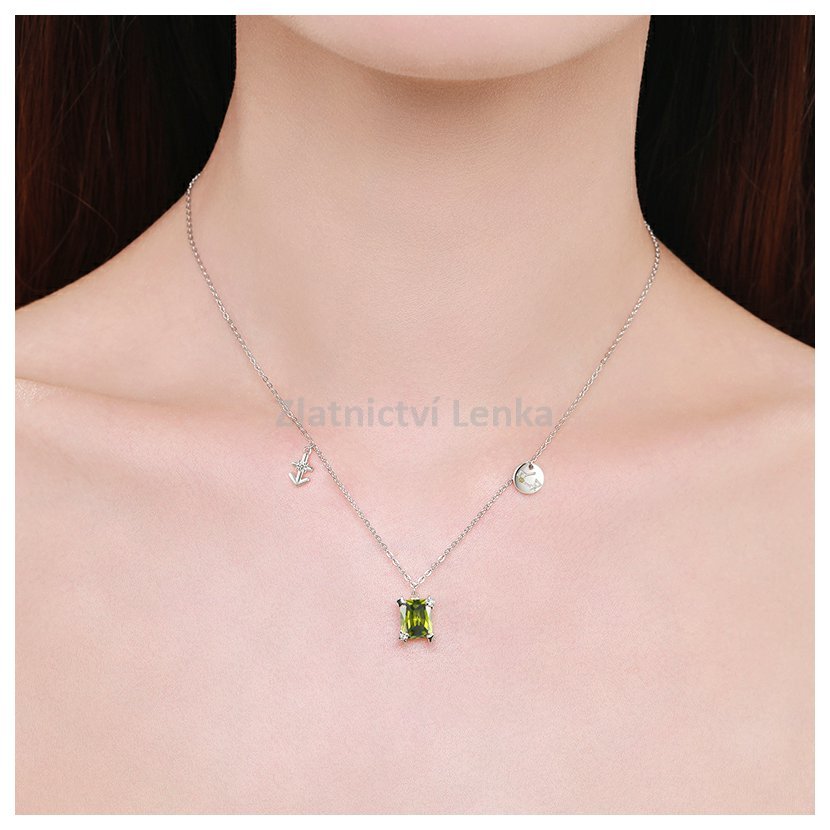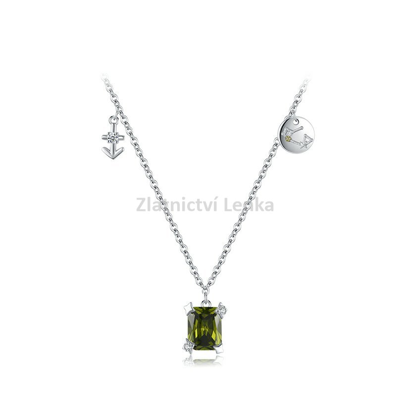 Tento elegantní náhrdelník ze sterlingového stříbra 925 je inspirován znamením Střelce. Dominantním prvkem je olivově zelený kámen v obdélníkovém brusu, který symbolizuje dobrodružného ducha, odvahu a lásku ke svobodě – vlastnosti, které jsou pro znamení Střelce typické. Náhrdelník je doplněn přívěskem ve tvaru kotvy, symbolizující stabilitu a spolehlivost, a destičkou s vyobrazením konstelace znamení Střelce. Tento jedinečný šperk je ideálním doplňkem pro ty, kteří chtějí nosit svůj astrologický symbol s elegancí a vkusem.