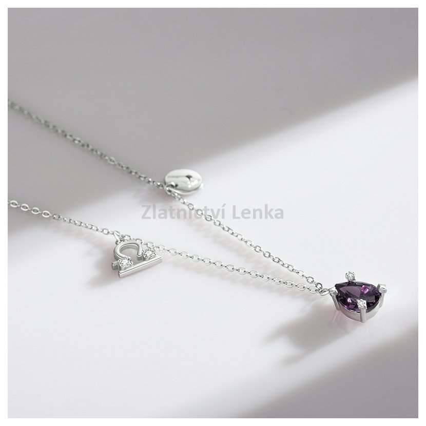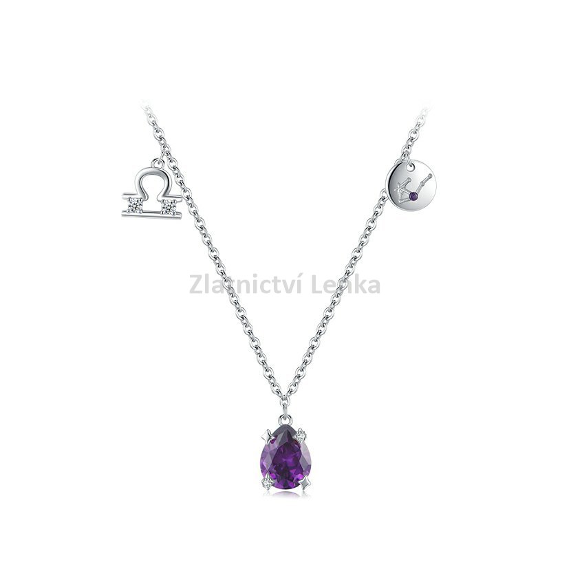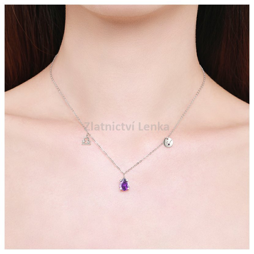 Tento náhrdelník je věnován znamení Váhy a je vyrobený z kvalitního sterlingového stříbra 925. Dominantním prvkem šperku je nádherný fialový kámen ve tvaru kapky, který symbolizuje harmonii, eleganci a klid – vlastnosti, které jsou pro znamení Váhy charakteristické. Náhrdelník je doplněn přívěskem se symbolem Váhy a destičkou s vyobrazením konstelace tohoto znamení, což šperku dodává osobní a luxusní vzhled. Perfektní dárek pro každou Váhu, která si přeje nosit svůj astrologický symbol s noblesou.