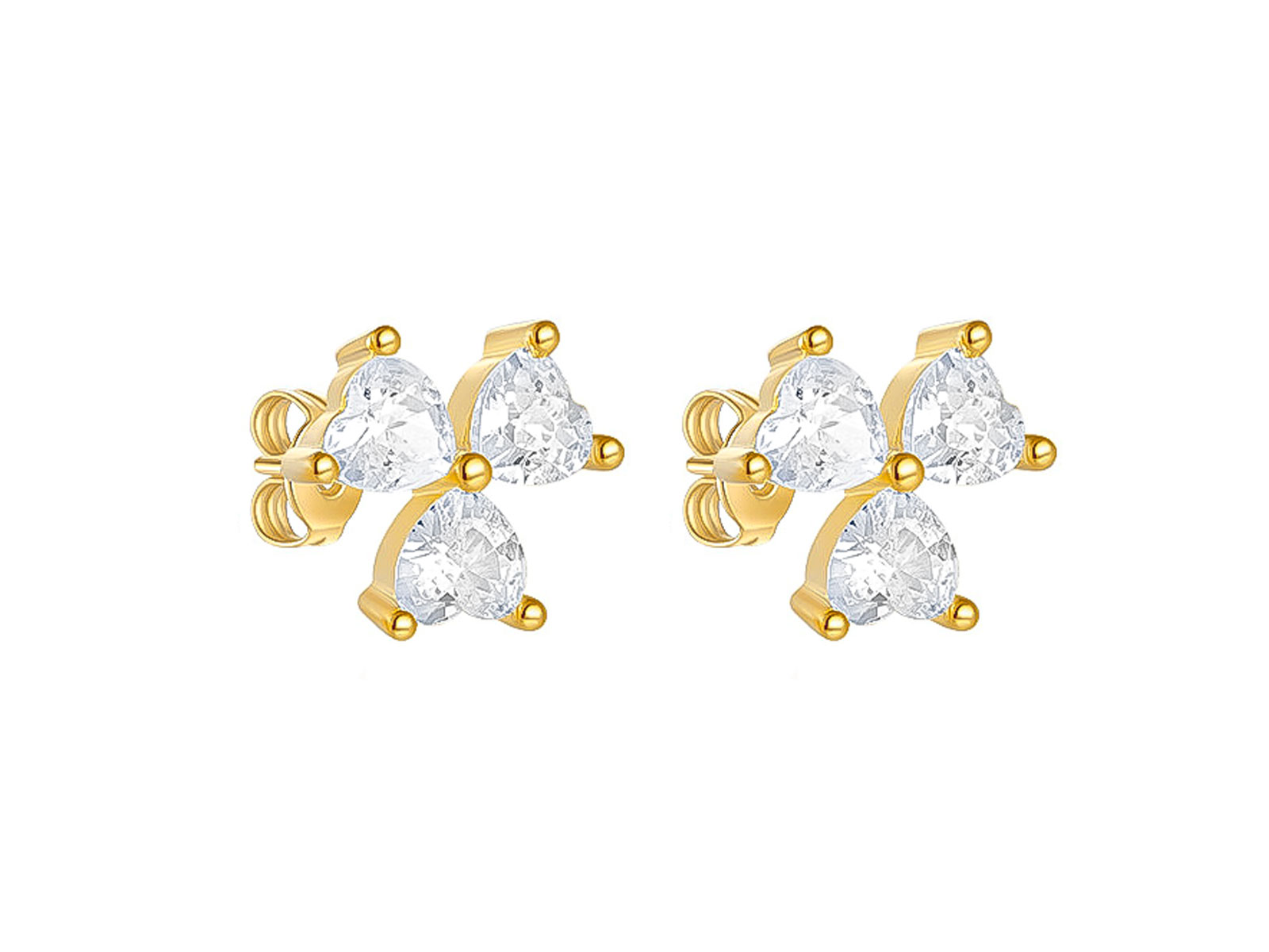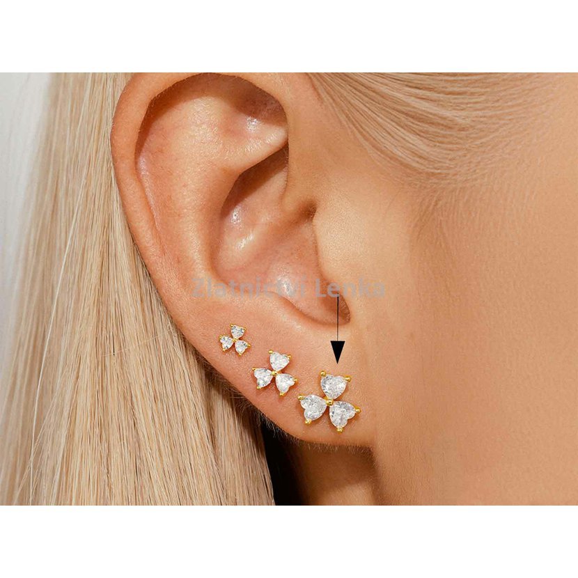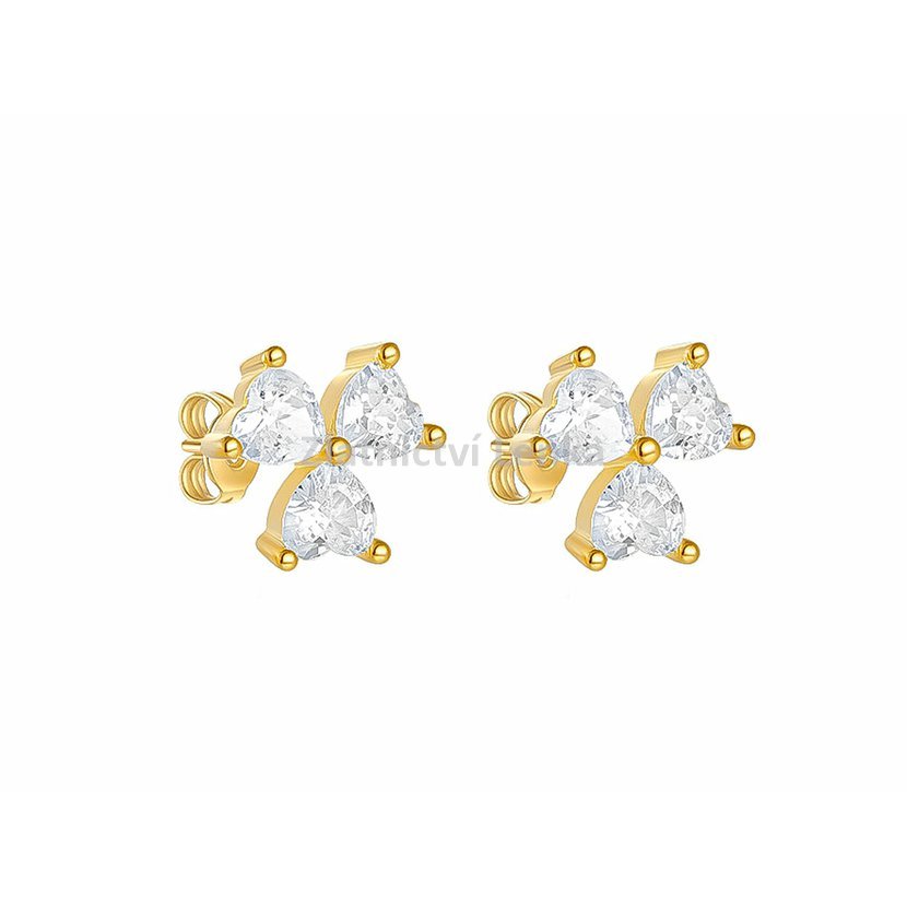 Zlacené náušnice ze stříbra 925/1000 zaujmou něžným motivem srdcí a jemným třpytem bílých zirkonů. Jejich romantický design působí velmi ženským dojmem a skvěle doplní jak decentní každodenní styl, tak i elegantnější outfit pro výjimečné příležitosti.