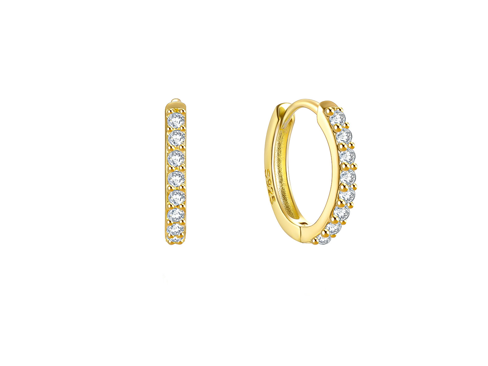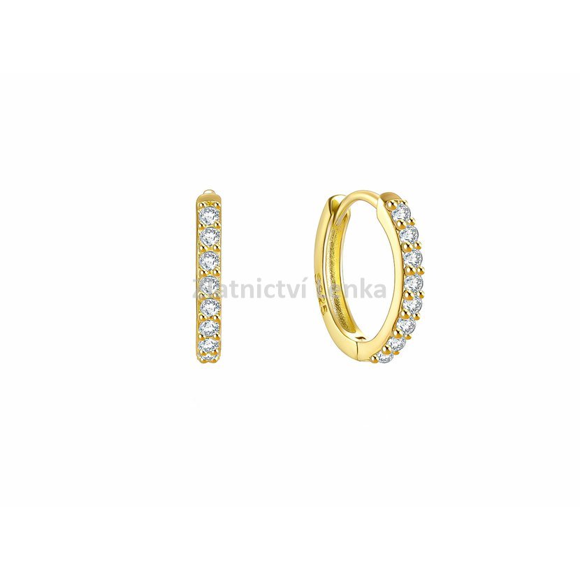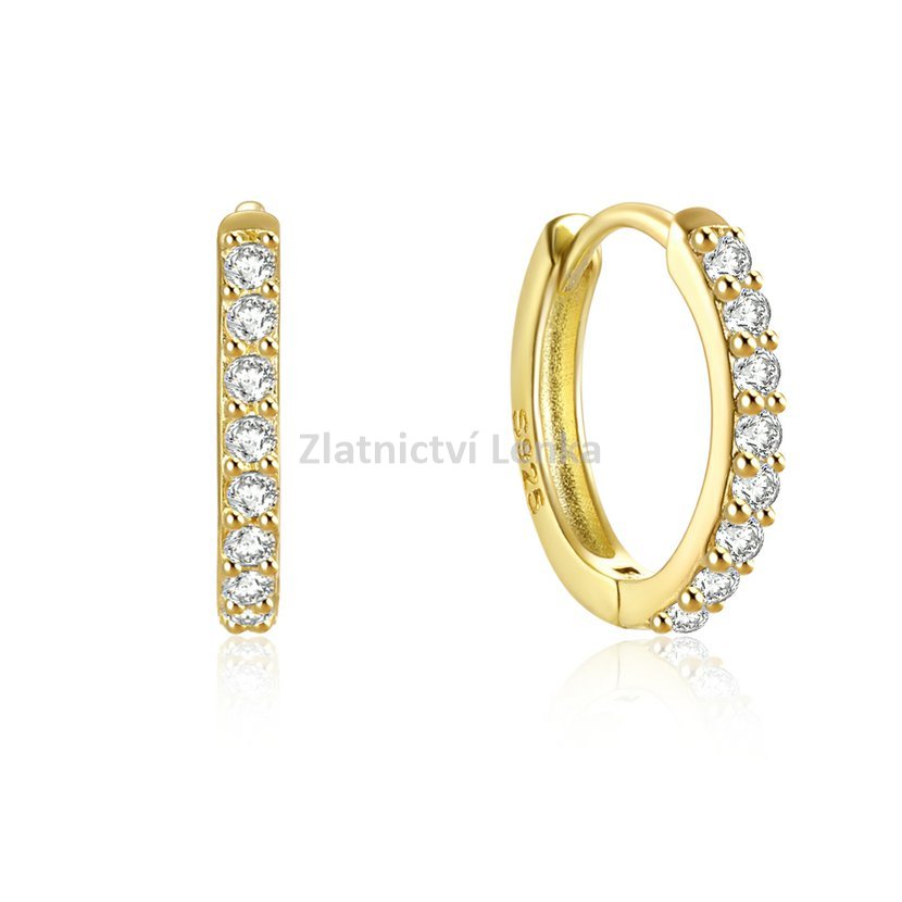 Zlacené kruhové náušnice ze stříbra 925/1000 zaujmou čistým minimalistickým designem a precizním osazením bílých zirkonů. Přední stranu kroužků zdobí souvislá řada kamenů, která vytváří elegantní třpytivý pás a krásně zvýrazňuje tvar náušnic. Zlacený povrch dodává šperku teplý zlatý tón, který v kombinaci s leskem zirkonů působí velmi sofistikovaně a ženským dojmem.