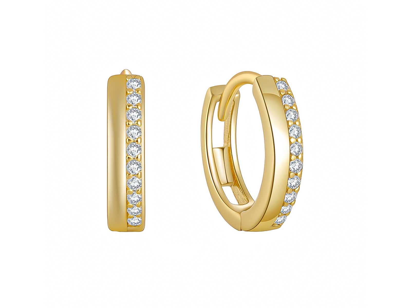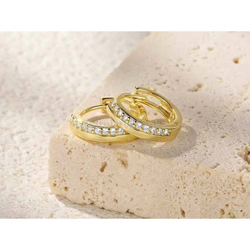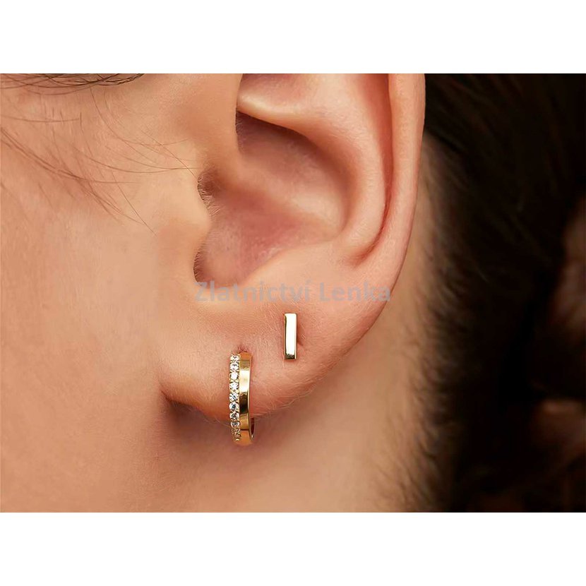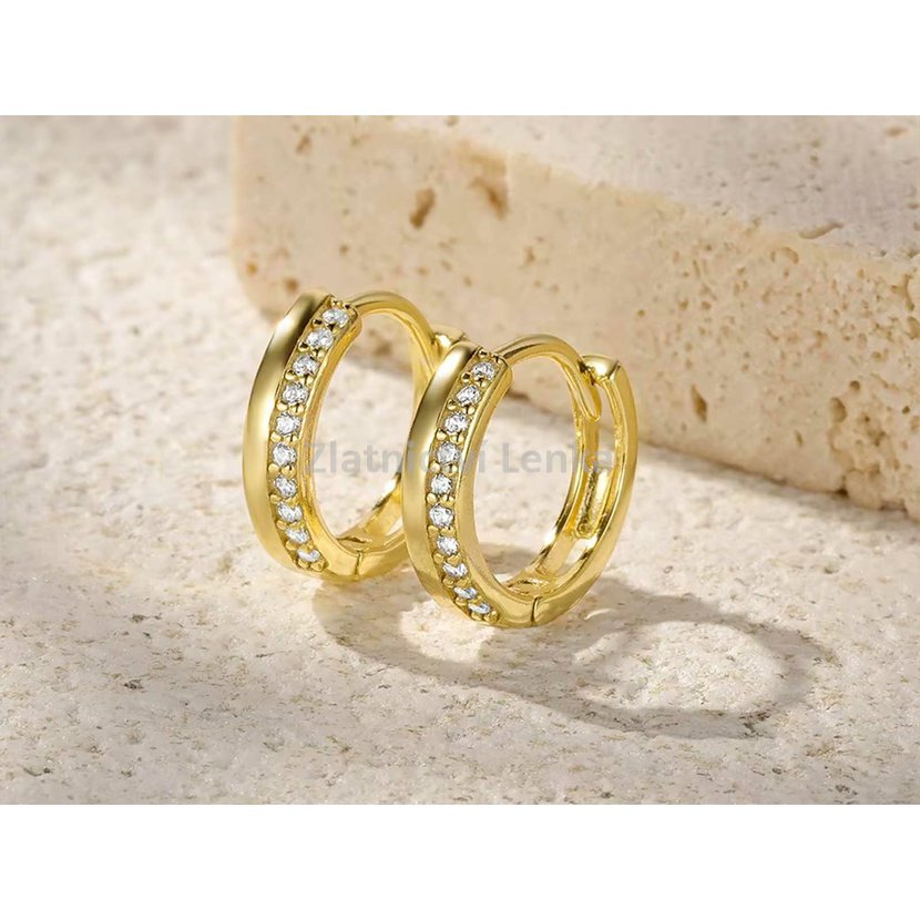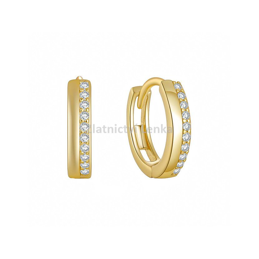 Zlacené kruhové náušnice ze stříbra 925/1000 zaujmou svým čistým designem a jemnou linií bílých zirkonů, které zdobí přední stranu kroužků. Precizně zasazené kameny krásně zachycují světlo a vytvářejí oslnivý třpyt při každém pohybu. Spojení hladkého lesklého povrchu a jemně zářivých kamenů působí luxusně, ale zároveň velmi decentně a vkusně.