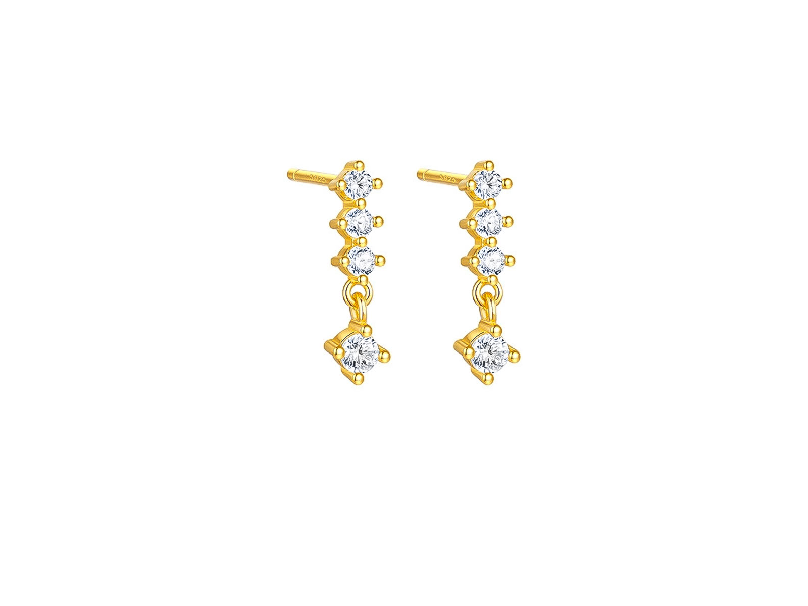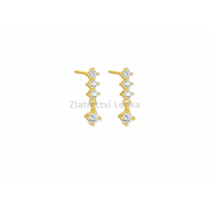Zlacené náušnice ze stříbra 925/1000 zdobí čtyři bílé kulaté zirkony uspořádané do jemné vertikální linie, která působí elegantně, vzdušně a velmi ženským dojmem. Spodní část doplňuje drobný pohyblivý detail, díky němuž náušnice při každém pohybu krásně zachycují světlo a získávají jemnou dynamiku. Celek působí harmonicky, moderně a zároveň nadčasově.
