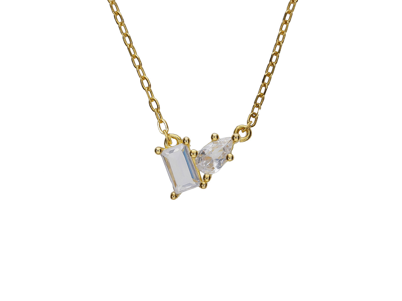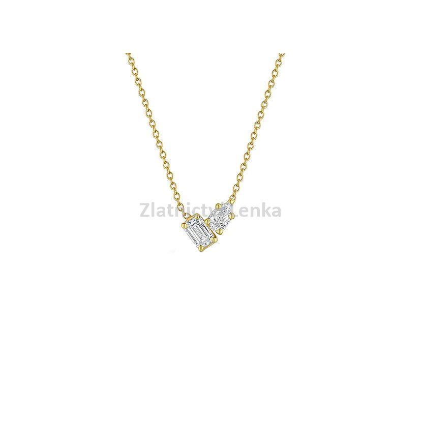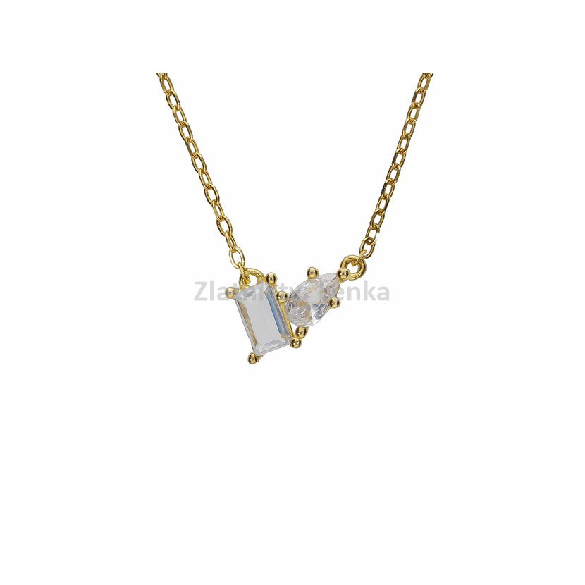 Zlacený náhrdelník ze stříbra 925/1000 zaujme originální kombinací dvou bílých zirkonů v rozdílných brusech, které společně vytvářejí jemný, ale nepřehlédnutelný detail. Obdélníkový kámen působí moderně a luxusně, zatímco kapkovitý zirkon dodává šperku jemnost, lehkost a ženský půvab. Tato asymetrická kompozice vytváří zajímavý světelný efekt a dodává náhrdelníku osobitý charakter.