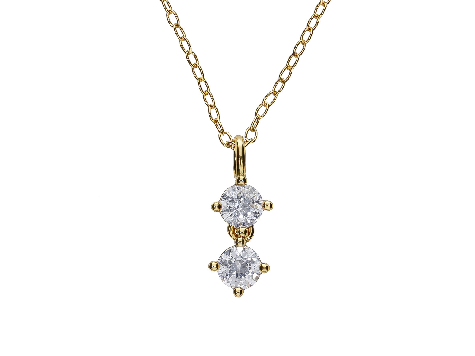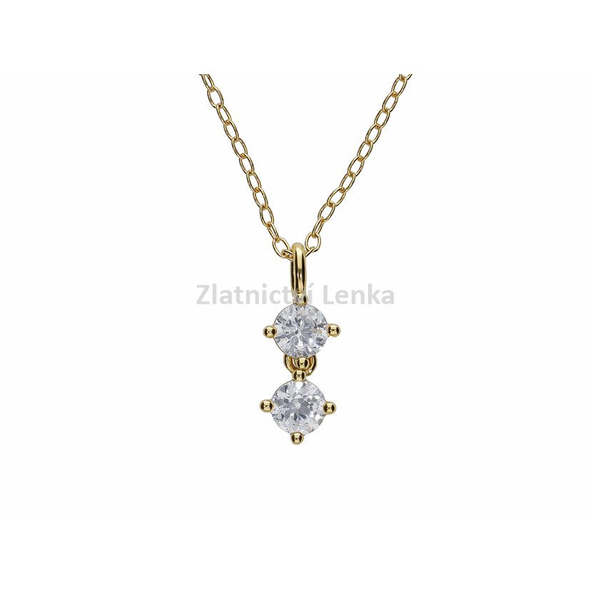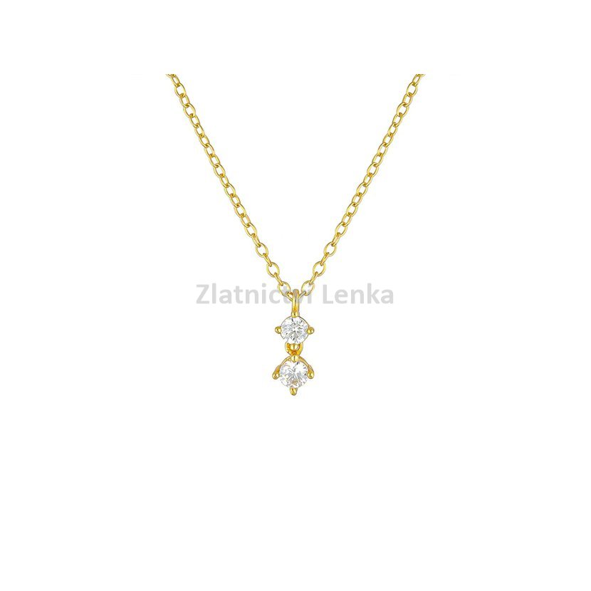 Zlacený náhrdelník ze stříbra 925/1000 zdobí dvojice bílých kulatých zirkonů zasazených pod sebou v decentních úchytech. Horní kámen plynule navazuje na jemný řetízek, zatímco spodní se volně pohybuje a při každém kroku i pohybu krásně zachycuje světlo. Tato kompozice působí jemně, elegantně a dodává šperku lehkost i sofistikovaný detail.