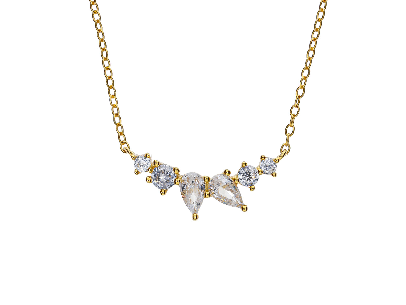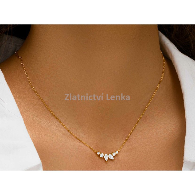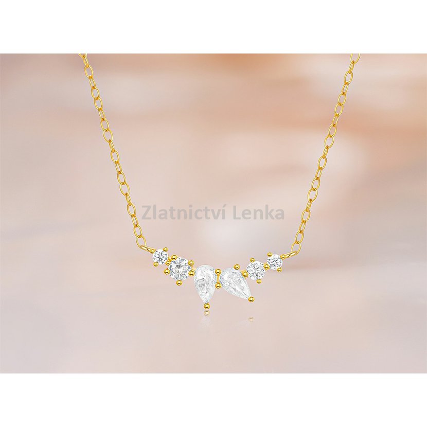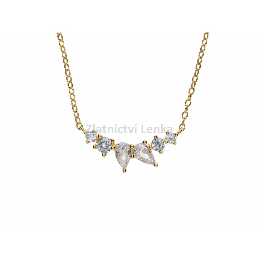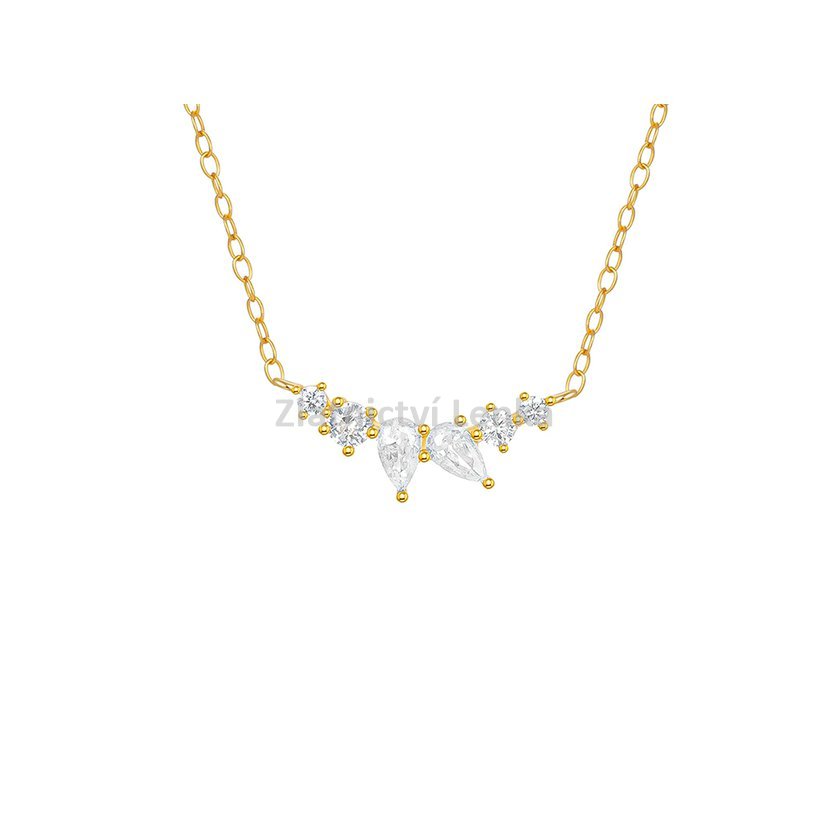 Zlacený náhrdelník ze stříbra 925/1000 zdobí jemná kompozice bílých zirkonů v kulatých a kapkových tvarech, která vytváří harmonický motiv s lehce květinovým nádechem. Precizně vsazené kameny krásně zachycují světlo a dodávají šperku jemný třpyt, který působí elegantně, lehce a velmi vkusně. Kombinace různých tvarů zároveň přináší šperku zajímavý detail a jemně romantický charakter.