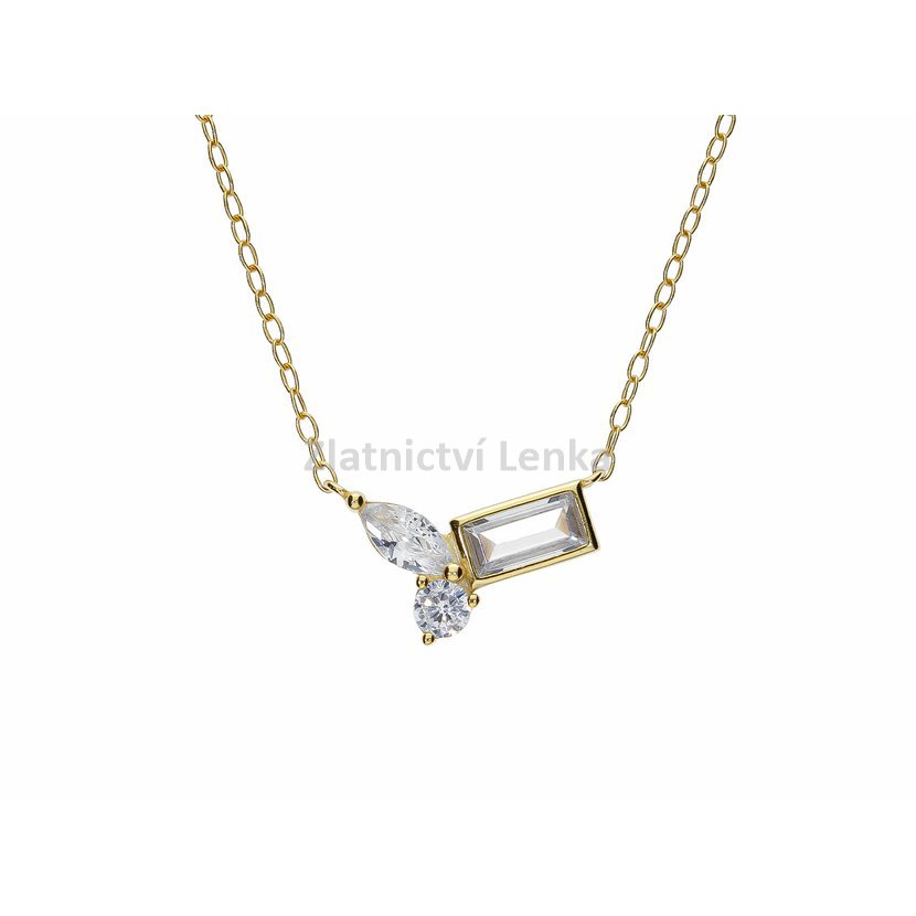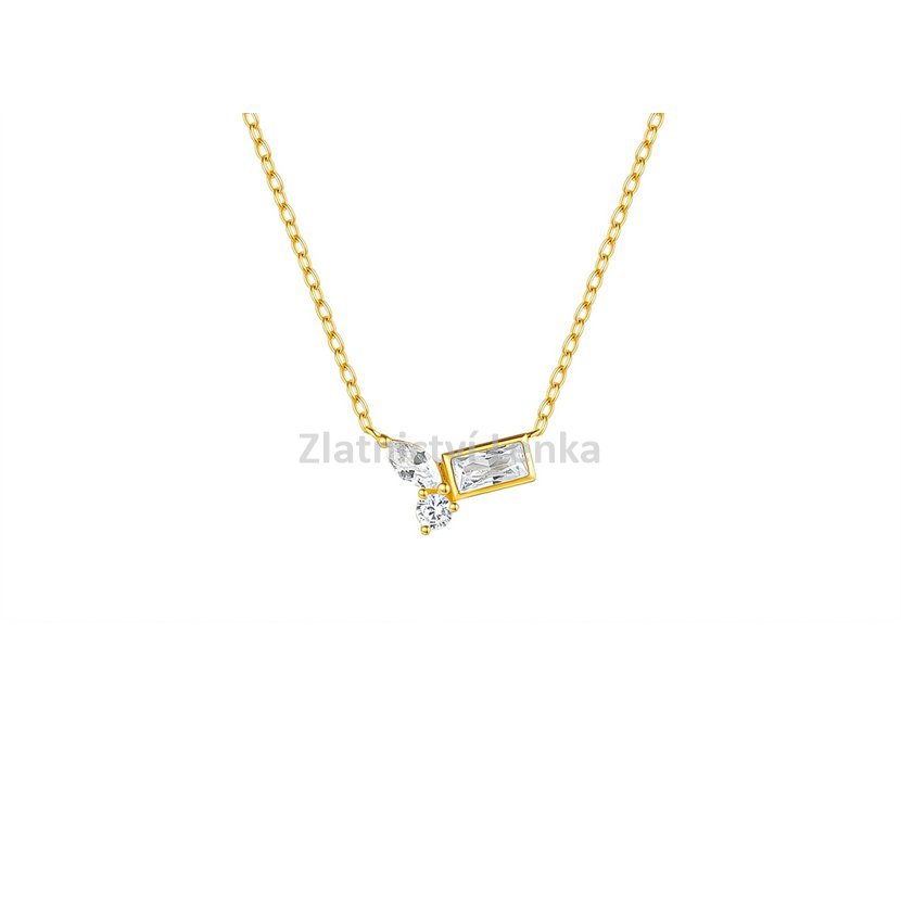 Zlacený náhrdelník ze stříbra 925/1000 zaujme jemnou kompozicí tří bílých zirkonů různých tvarů, která vytváří moderní a přitom harmonický celek. Prodloužený obdélníkový kámen doplňuje jemný kulatý a kapkovitý zirkon, díky čemuž šperk působí sofistikovaně, neotřele a zároveň velmi vkusně. Precizně broušené kameny krásně zachycují světlo a dodávají náhrdelníku jemný luxusní třpyt.