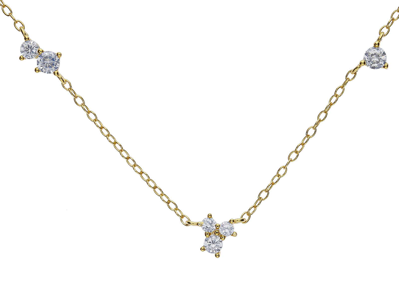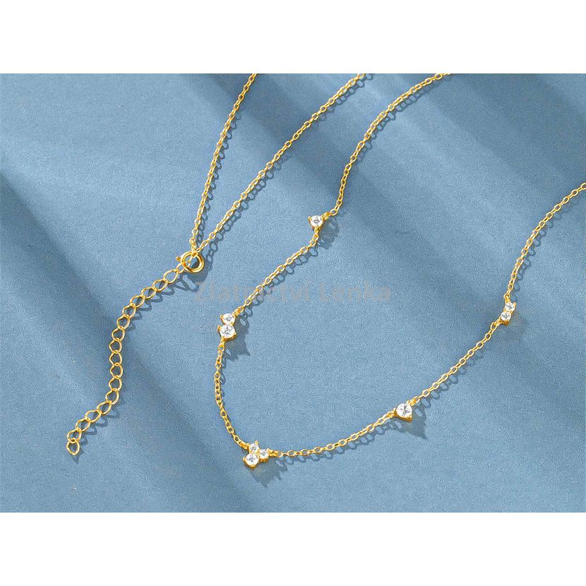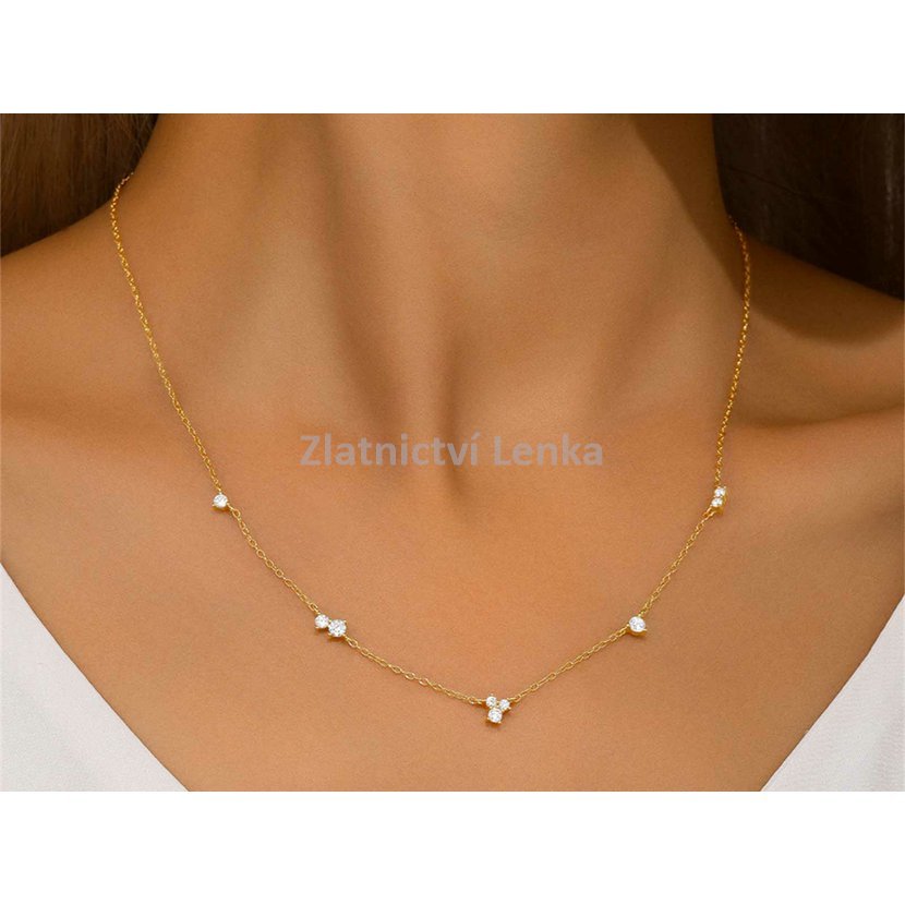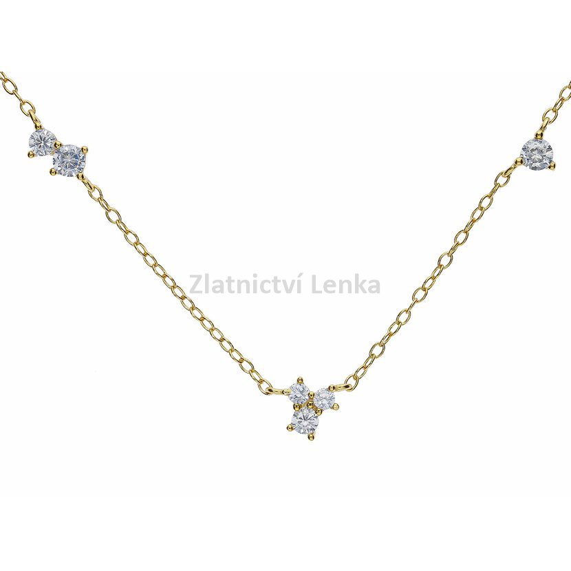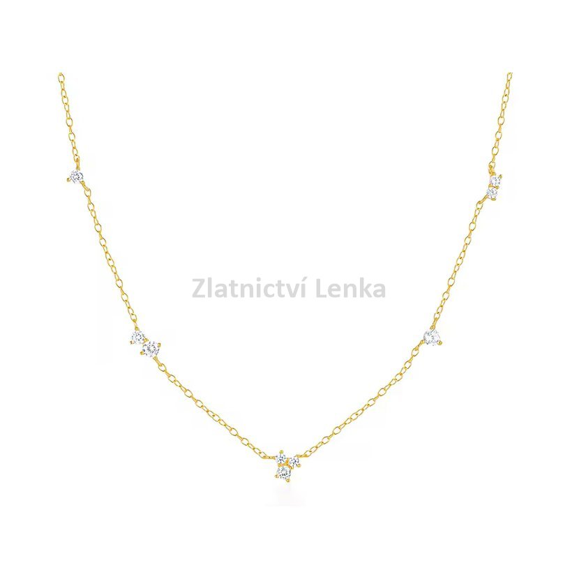 Zlacený náhrdelník ze stříbra 925/1000 zdobí několik bílých kulatých zirkonů rovnoměrně rozmístěných podél jemného řetízku. Jejich třpyt vytváří decentní, ale velmi působivý efekt, který dodává šperku lehkost, eleganci a ženský půvab. Minimalistické provedení působí čistě a nadčasově, takže se náhrdelník snadno kombinuje s dalšími doplňky i různými styly oblečení.