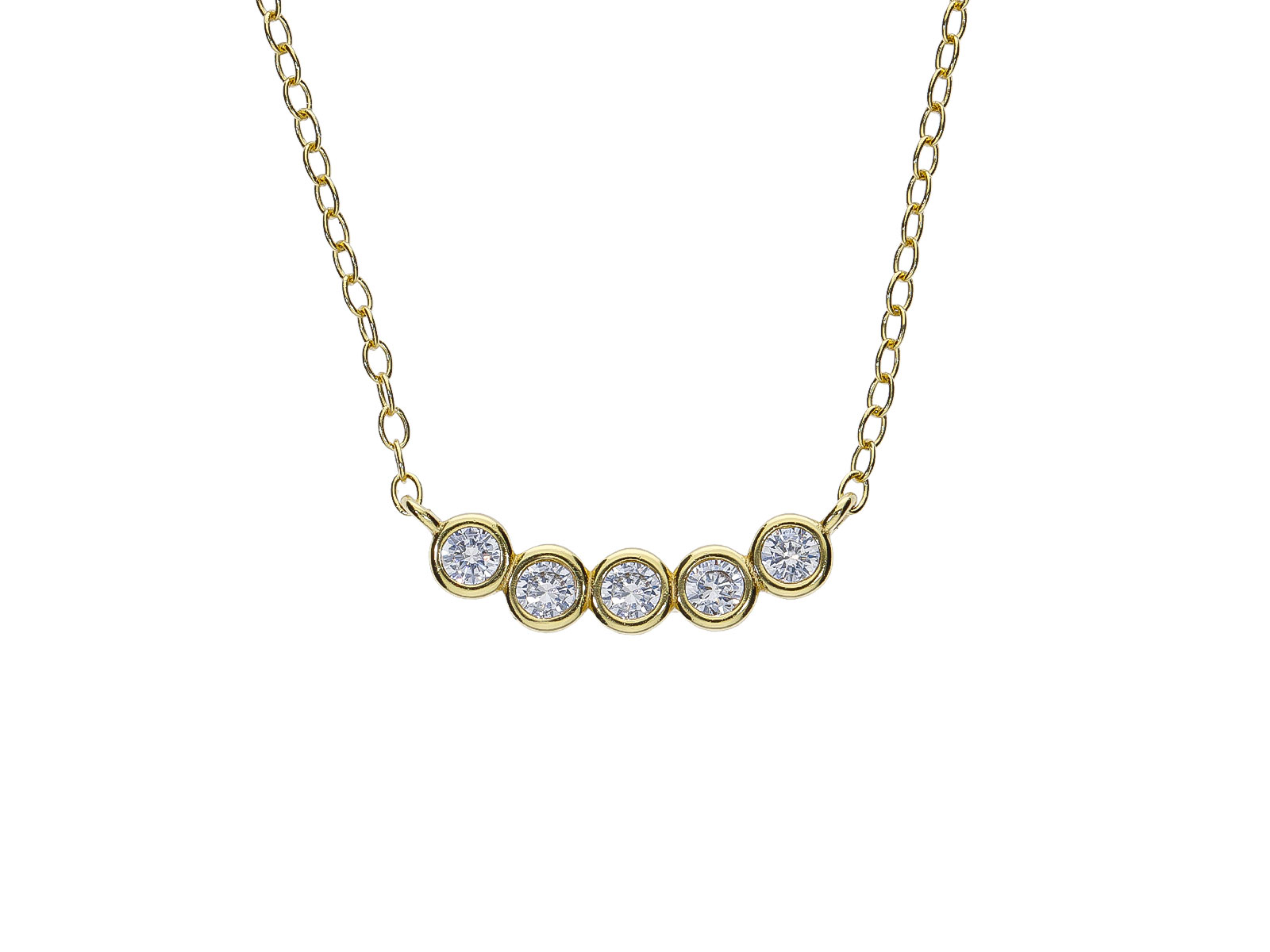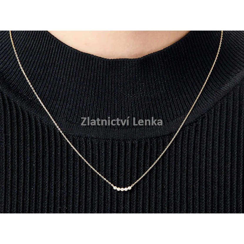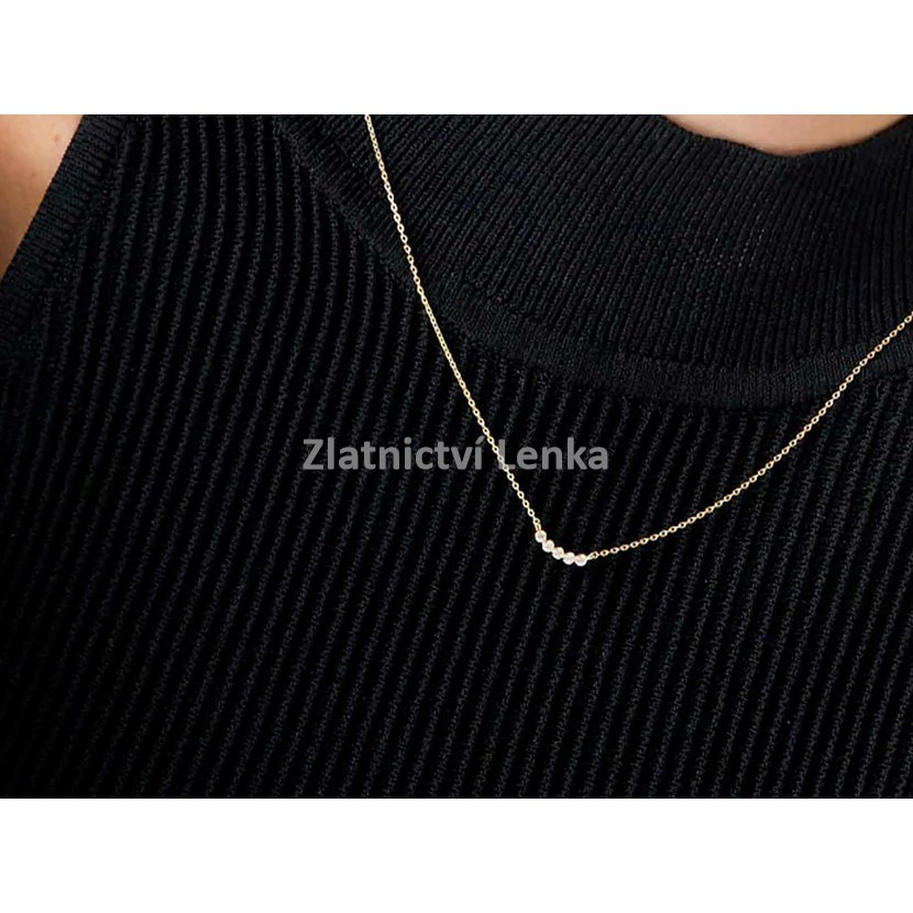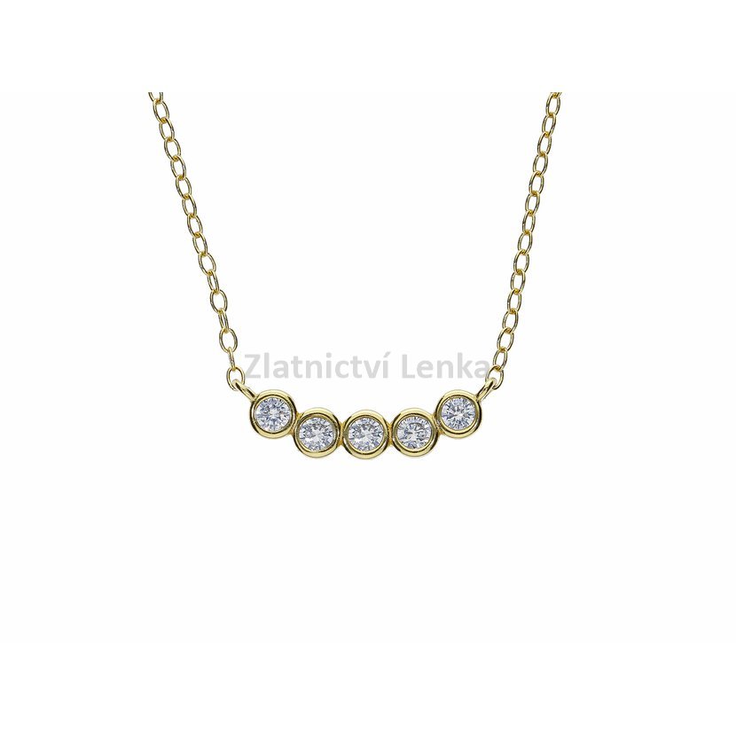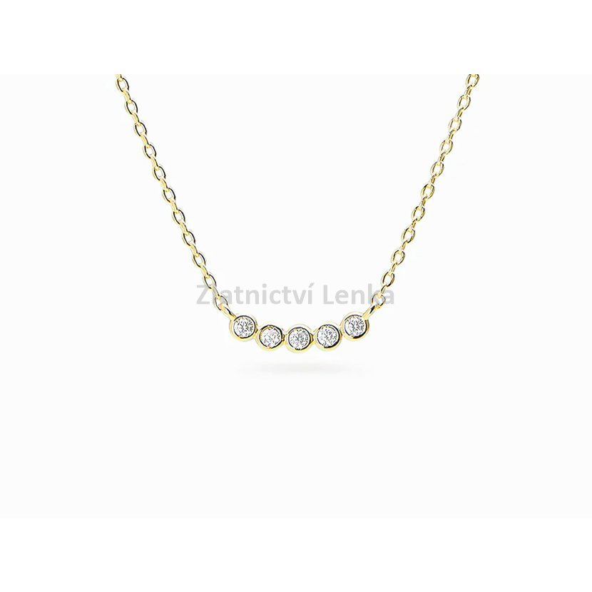 Zlacený náhrdelník ze stříbra 925/1000 zdobí pět bílých kulatých zirkonů usazených vedle sebe v hladkém moderním lůžku. Tato harmonická kompozice vytváří čistý, vyvážený a velmi elegantní vzhled, který působí jemně, ale zároveň dokáže dekolt krásně rozzářit. Třpyt zirkonů v kombinaci se zlaceným povrchem dodává šperku sofistikovaný a nadčasový charakter.
