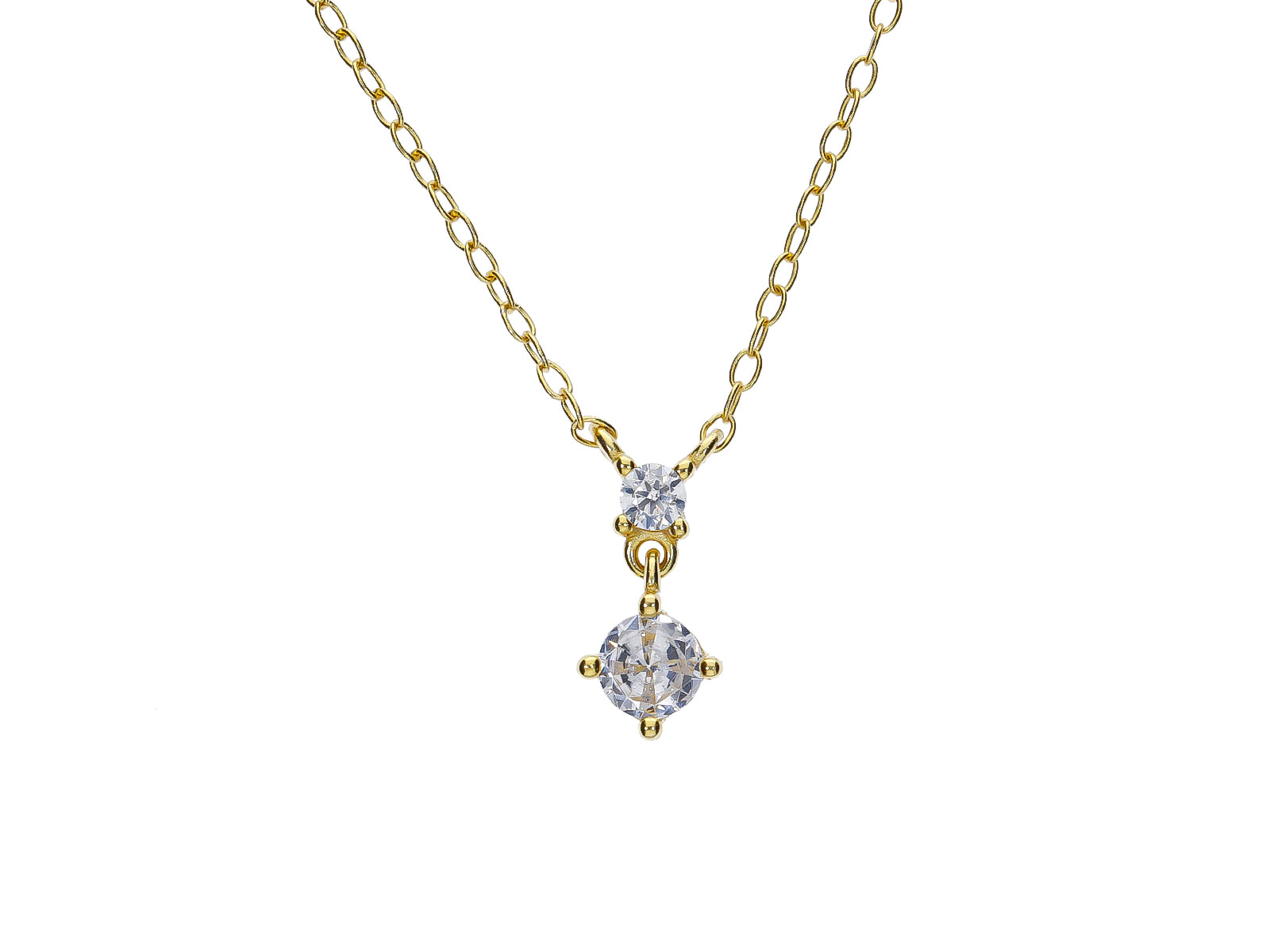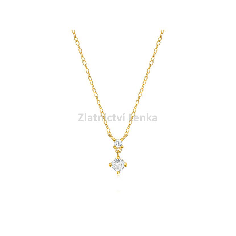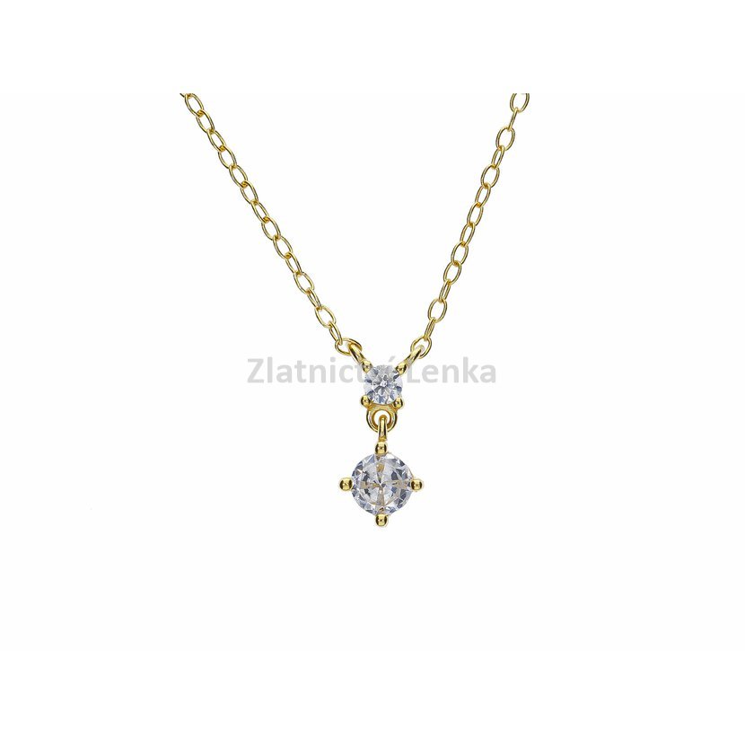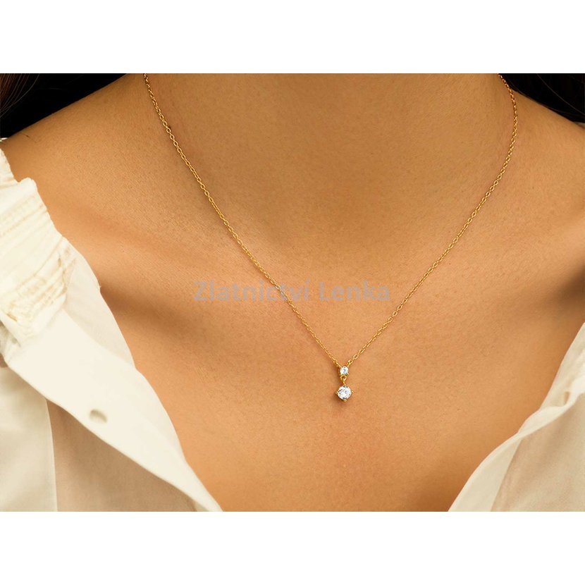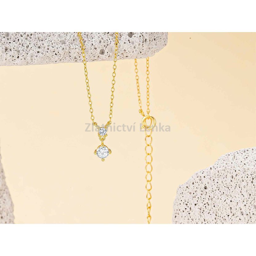 Zlacený náhrdelník ze stříbra 925/1000 zdobí dva bílé kulaté zirkony uspořádané do jemného vertikálního závěsu, který působí velmi elegantně a nadčasově. Menší horní kámen plynule navazuje na spodní dominantnější zirkon, jenž při pohybu krásně zachycuje světlo a dodává šperku decentní třpyt. Celek působí lehce, čistě a velmi vkusně.