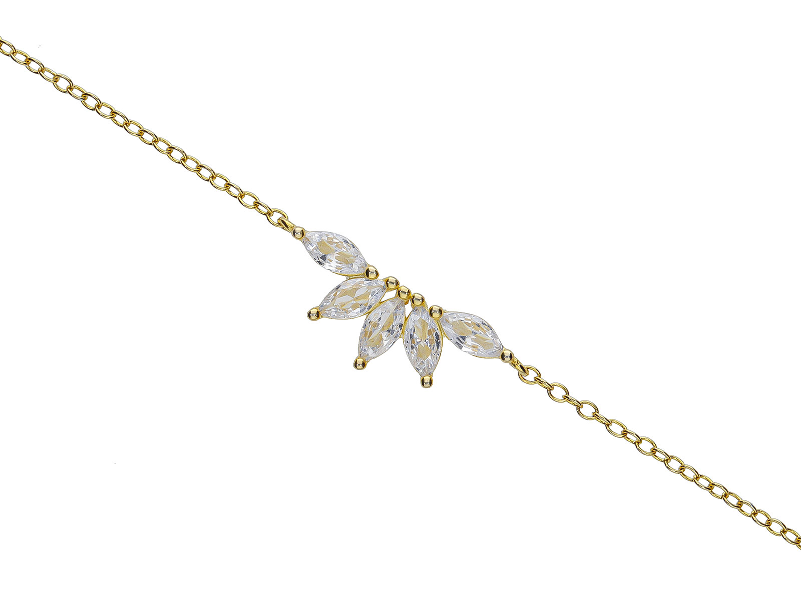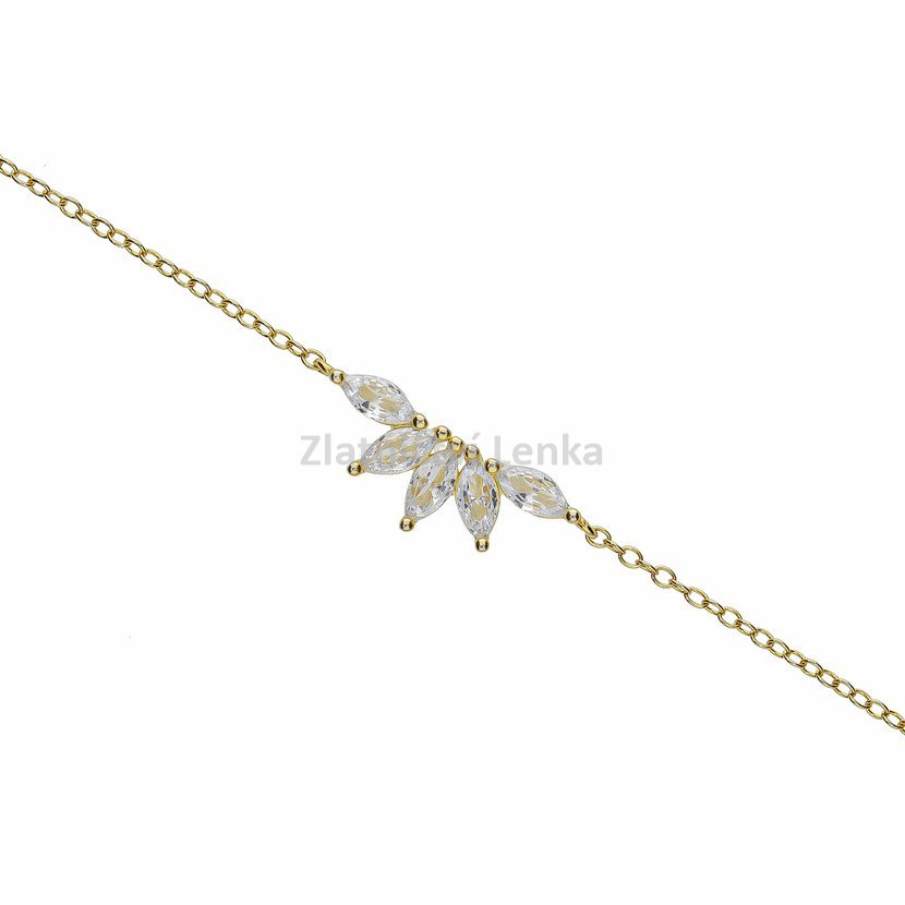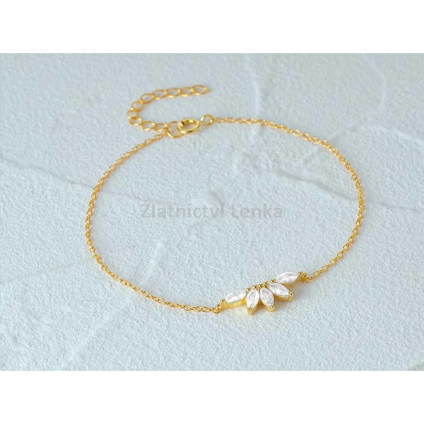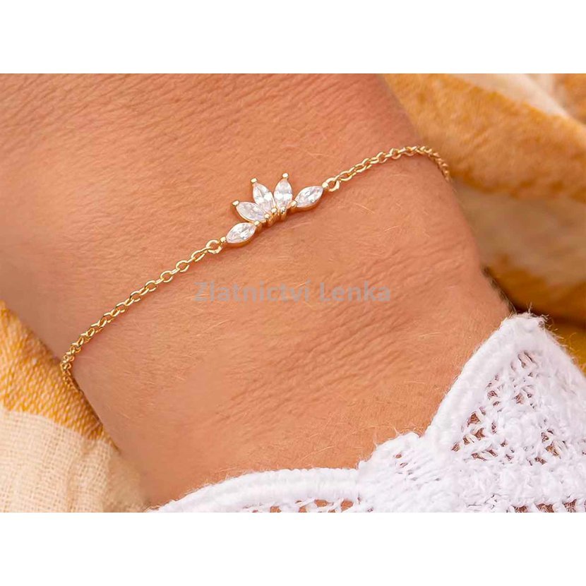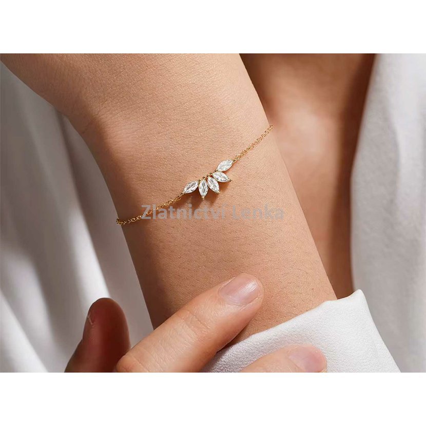 Zlacený náramek ze stříbra 925/1000 zdobí jemná kompozice bílých zirkonů broušených do kapkového tvaru, které společně vytvářejí elegantní motiv připomínající květ nebo jemně rozevřený vějíř světla. Precizně broušené kameny nádherně zachycují světlo a dodávají šperku jemný, ale nepřehlédnutelný třpyt. Celek působí lehce, luxusně a velmi vkusně.