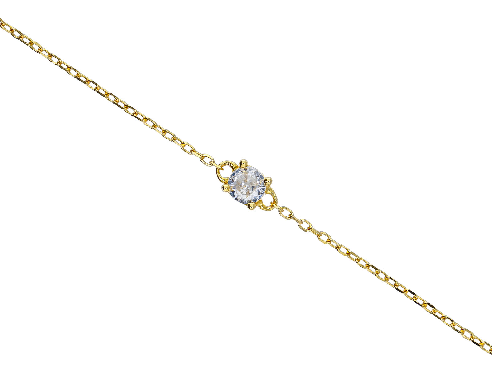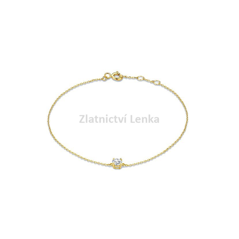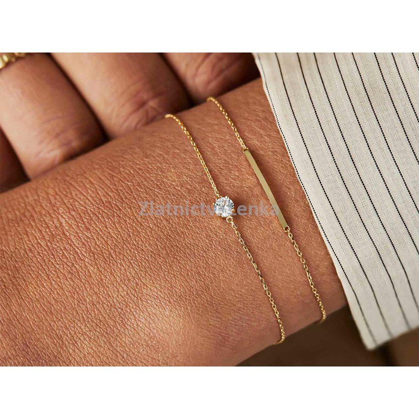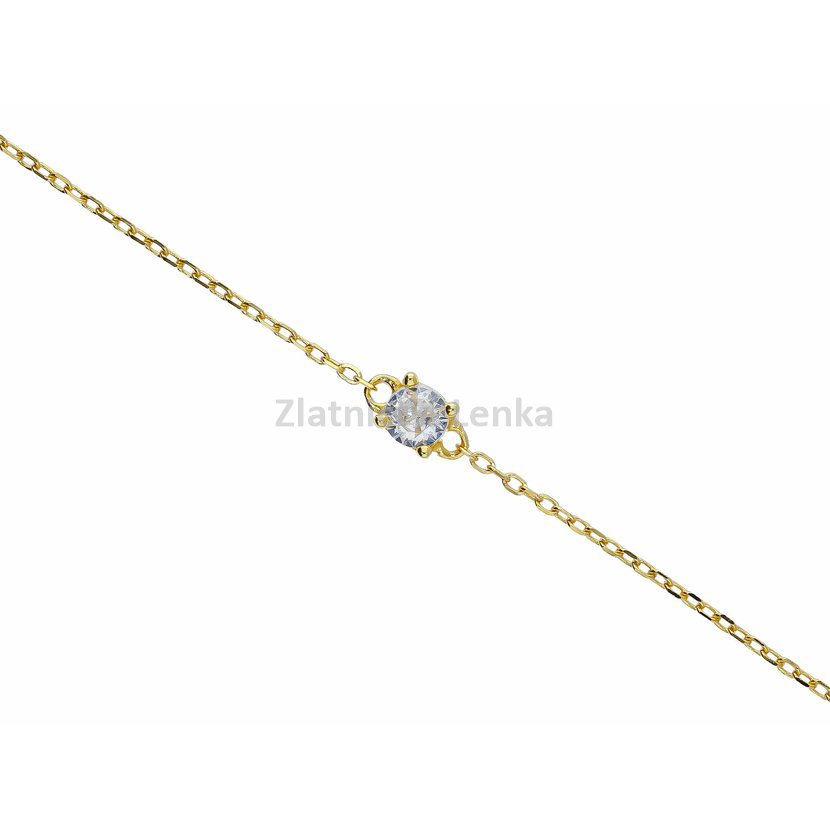 Zlacený náramek ze stříbra 925/1000 zdobí jemný bílý zirkon o velikosti 4 mm, který je zasazen do decentní čtyřbodové obruby. Minimalistické provedení působí velmi čistě, lehce a elegantně, takže šperk snadno doplní jak běžný denní outfit, tak i slavnostnější styl. Třpyt zirkonu dodává náramku jemný luxusní akcent, aniž by působil výrazně.