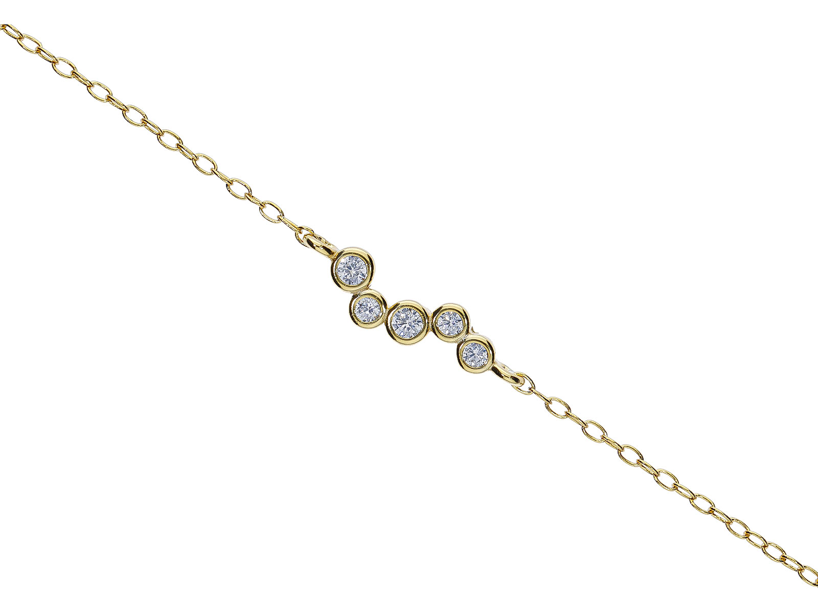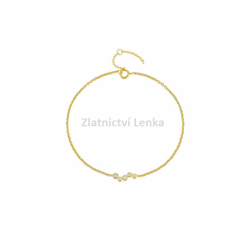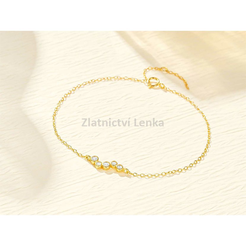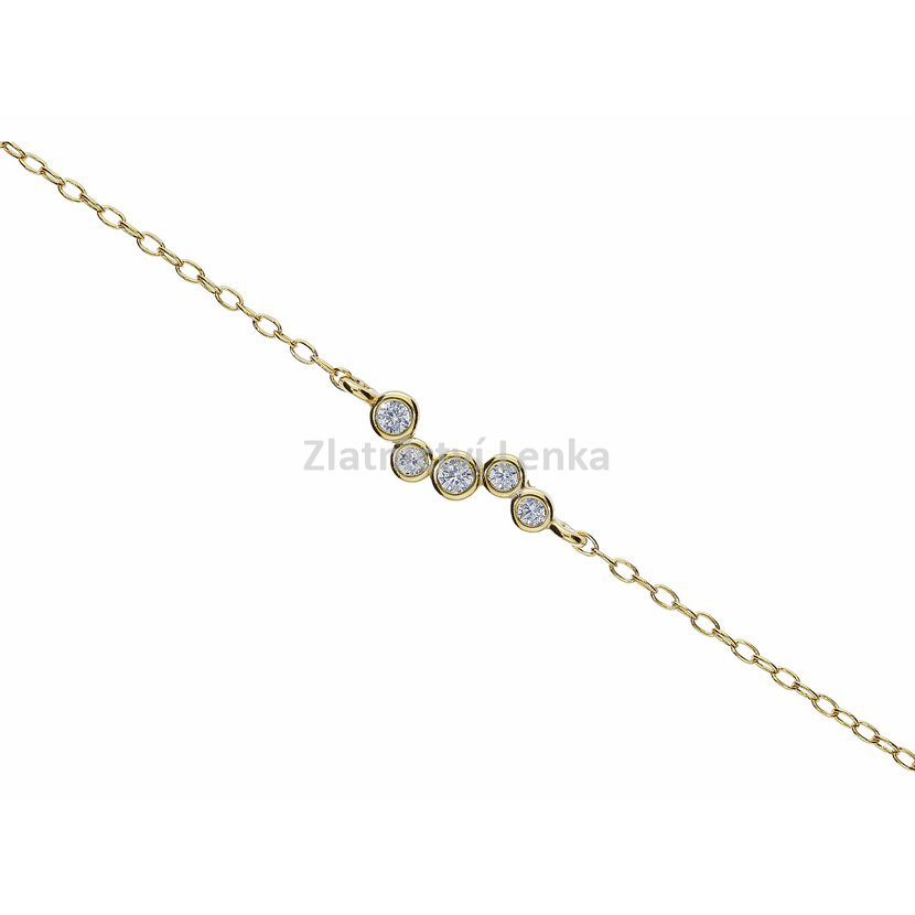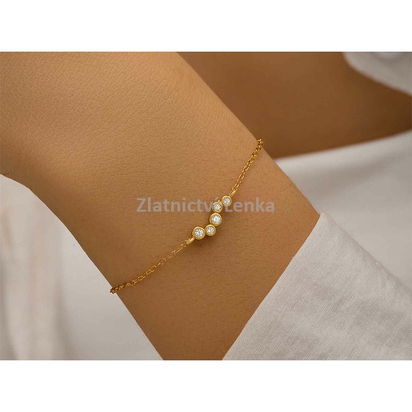 Zlacený náramek ze stříbra 925/1000 zdobí pět bílých kulatých zirkonů usazených vedle sebe v hladkém moderním lůžku. Tato harmonická kompozice vytváří čistý, vyvážený a velmi elegantní vzhled, který působí jemně, ale zároveň dokáže na zápěstí krásně vyniknout. Třpyt zirkonů v kombinaci se zlaceným povrchem dodává šperku sofistikovaný a nadčasový charakter.