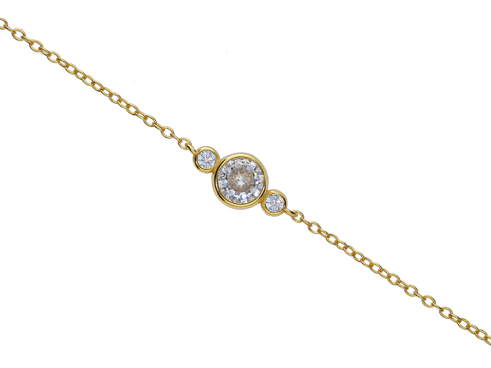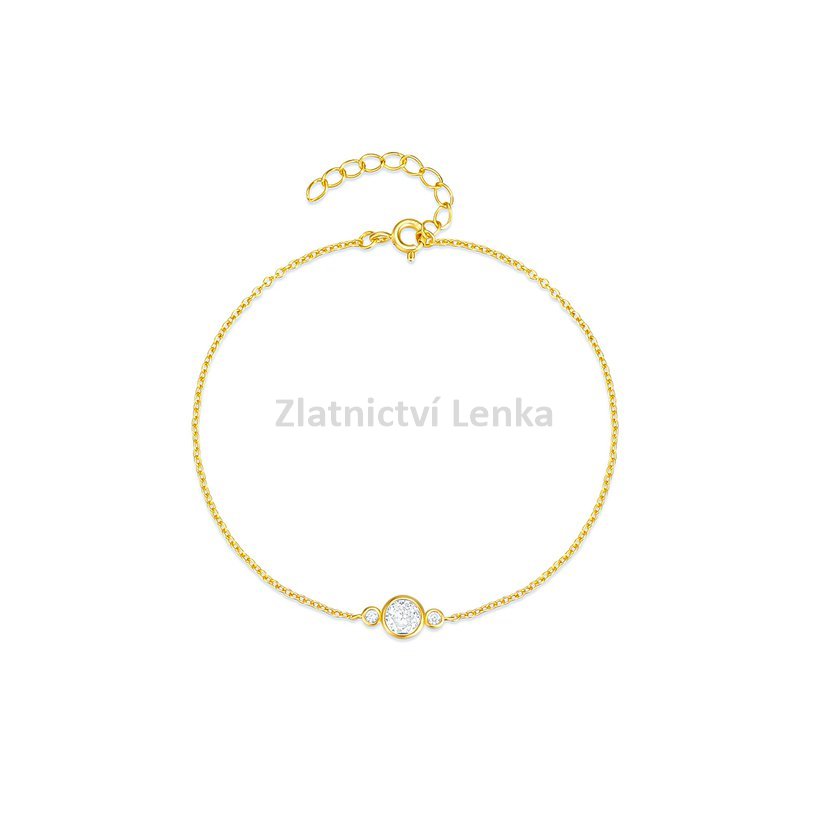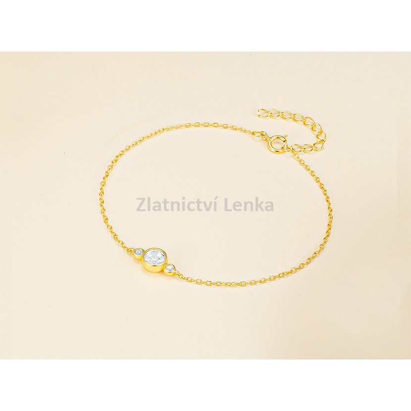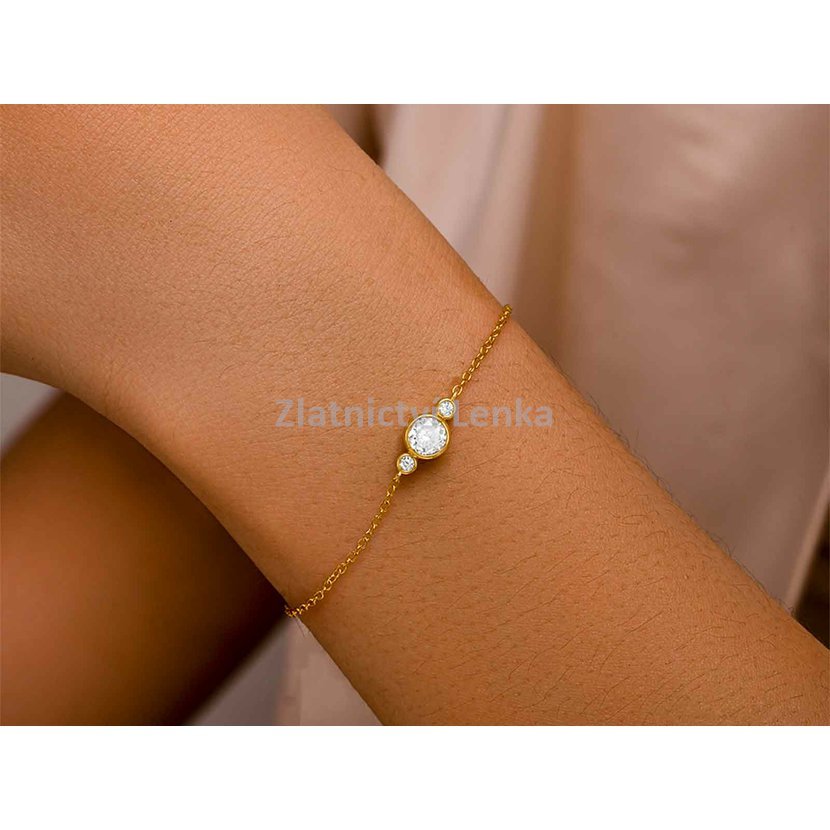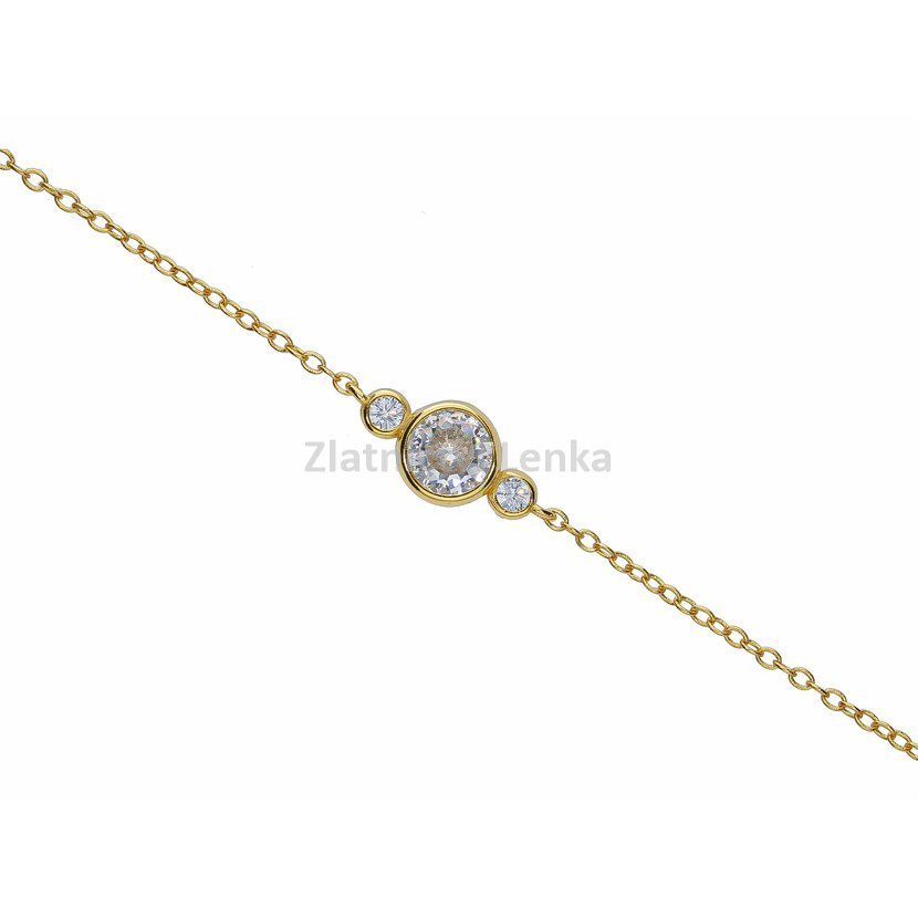Zlacený náramek ze stříbra 925/1000 zdobí trojice bílých kulatých zirkonů, která vytváří harmonickou a elegantní kompozici. Středový kámen je výraznější a dodává šperku jemný luxusní akcent, zatímco postranní zirkony celek vyvažují a podtrhují jeho čistý, moderní vzhled. Hladké lůžko kamenů a minimalistické provedení působí velmi nadčasově a vkusně.