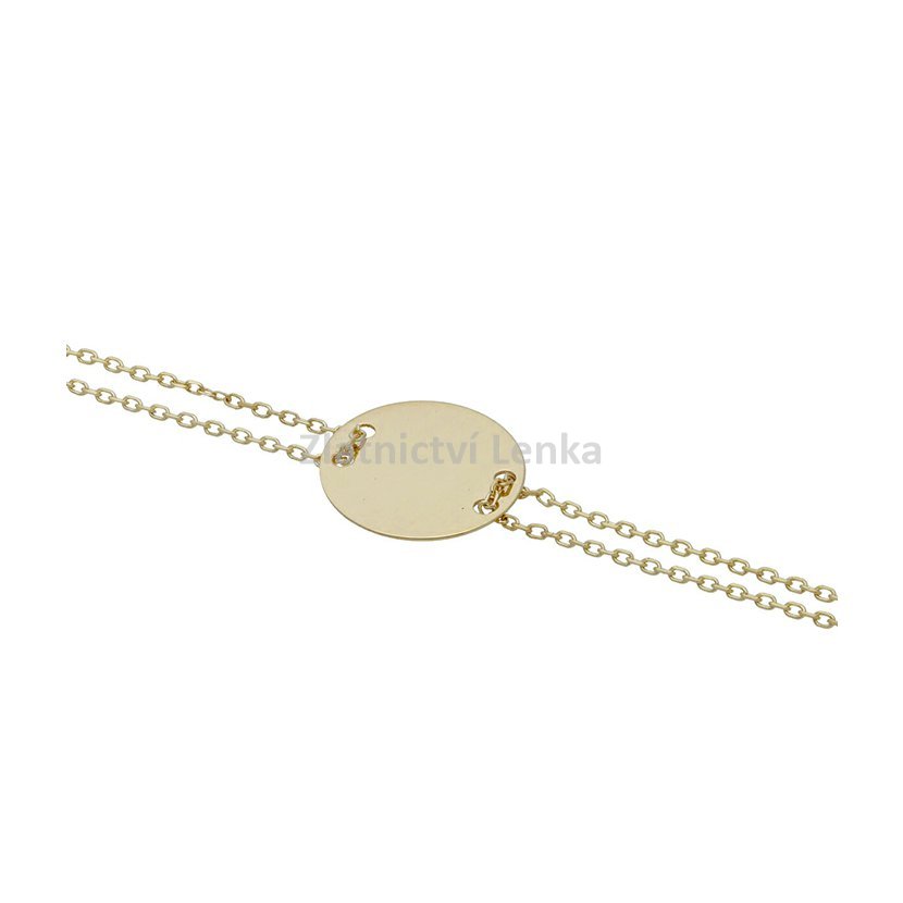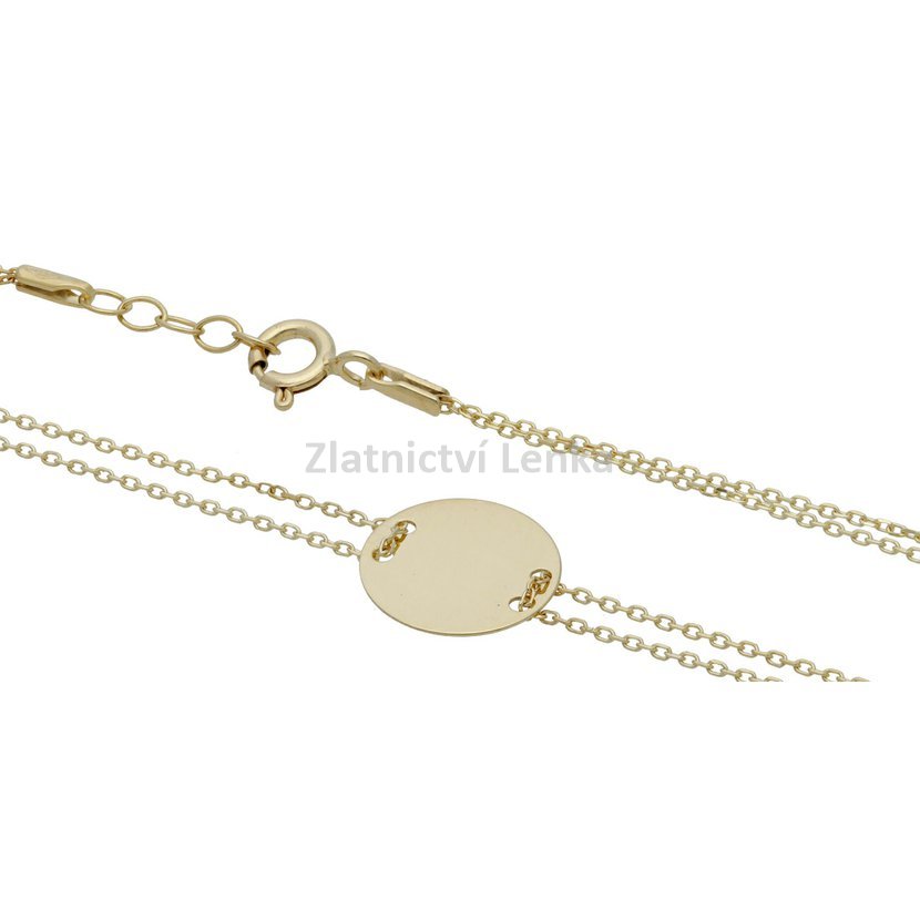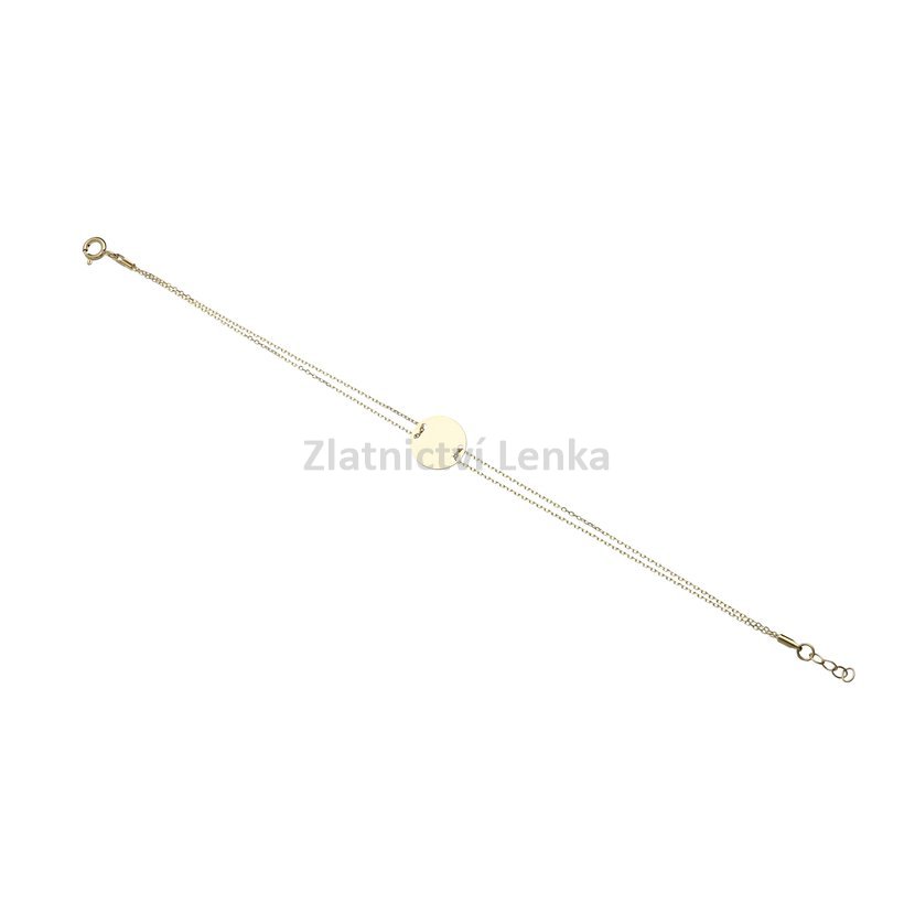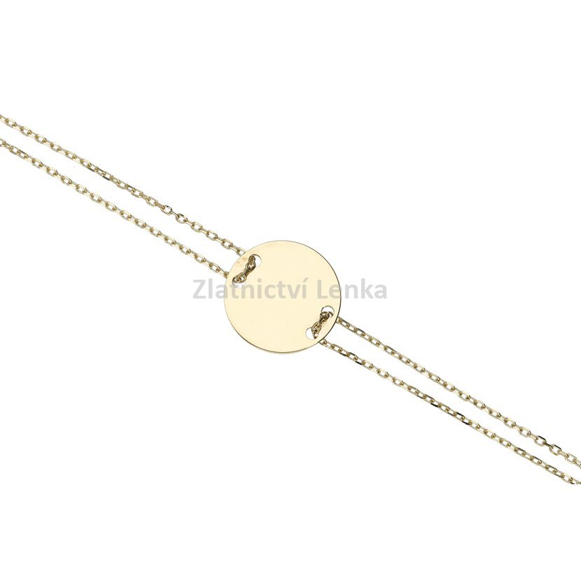 Zlatý náramek s medailonkem ve tvaru kolečka, který je provlíknutý na dvojitém řetízku. Šperk je vhodný k rytí.
