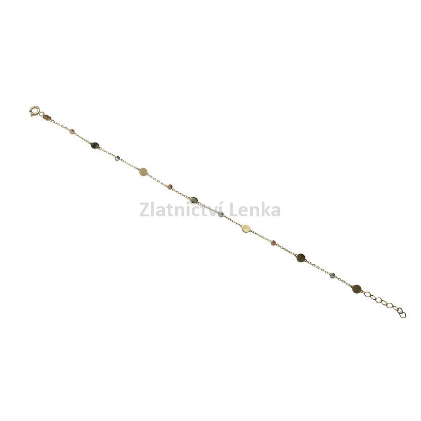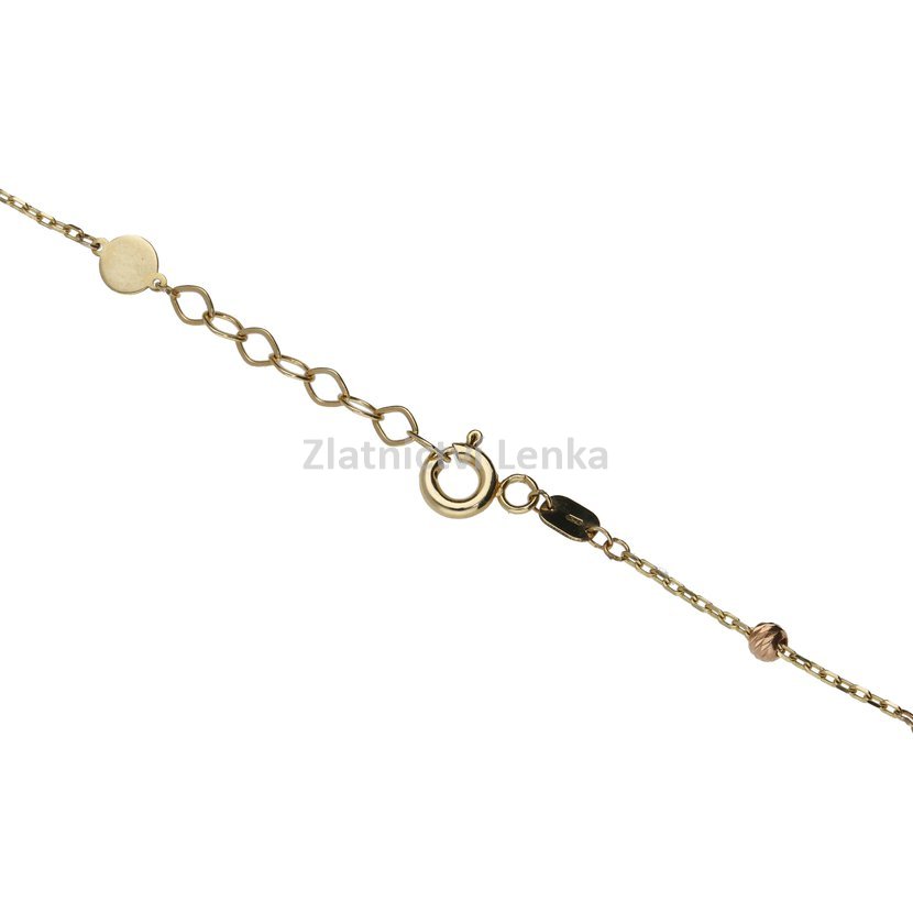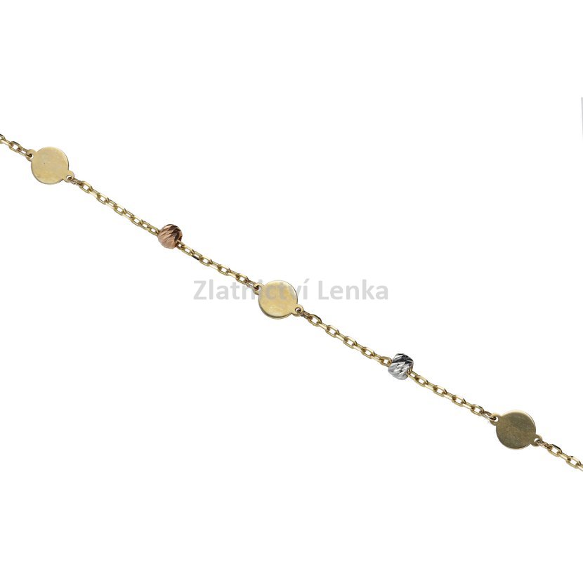Zlatý náramek s přívěsky koleček a zdobených kuliček a prodlužovacími očky.