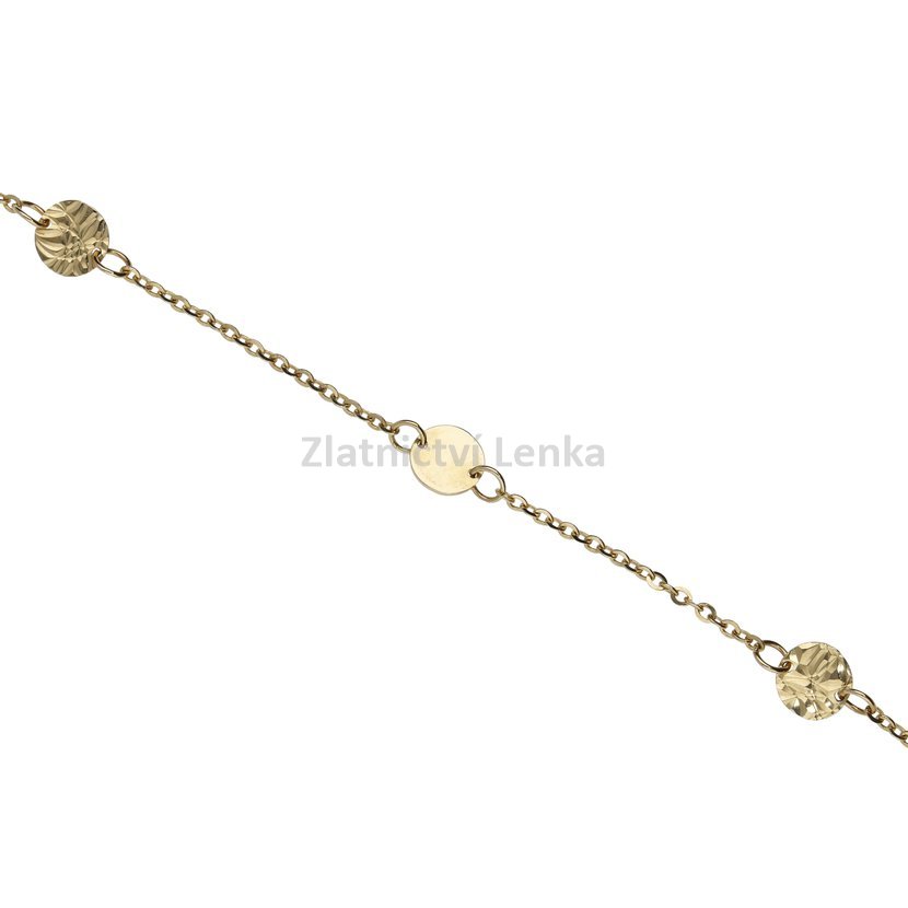 Zlatý náramek s přívěsky zdobených koleček a prodlužovacími očky.